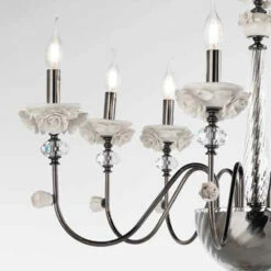 De 18-lichts kroonluchter is een luxe verlichtingsaccessoire dat volledig handgemaakt is in Italië met een structuur met metalen afwerkingen gecombineerd met geblazen glas en optisch kristal van hoge kwaliteit.