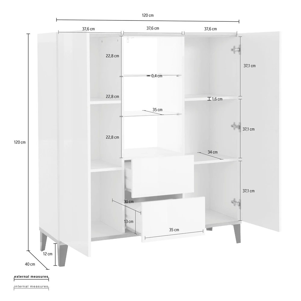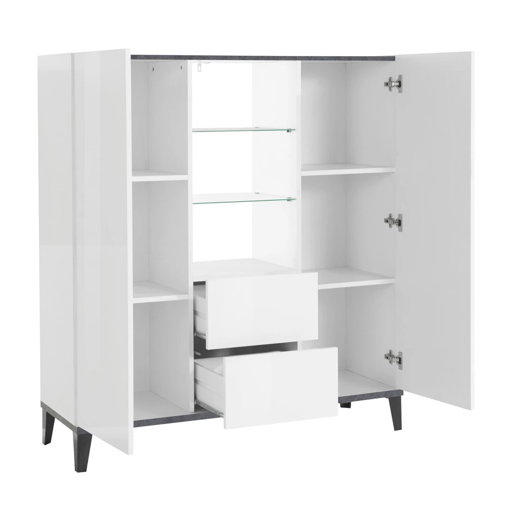 Modern dressoir gemaakt van melaminehout , compleet met scharnierende deuren , 2 centrale glazen planken, 2 schuifladen aan de onderkant en 7 praktische compartimenten die het product ruim en functioneel maken. Het is een meubel met een minimaal ontwerp dat een elegante esthetiek combineert met een brede bruikbaarheid .