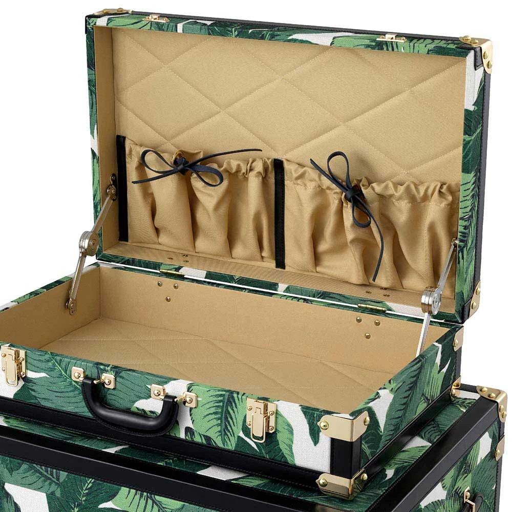 Prachtige compositie van 3 trunks van verschillende groottes met structuur in mdf bedekt met stof (100% polyester) verrijkt met gouden afwerking details en zwart lederen effect bandjes.