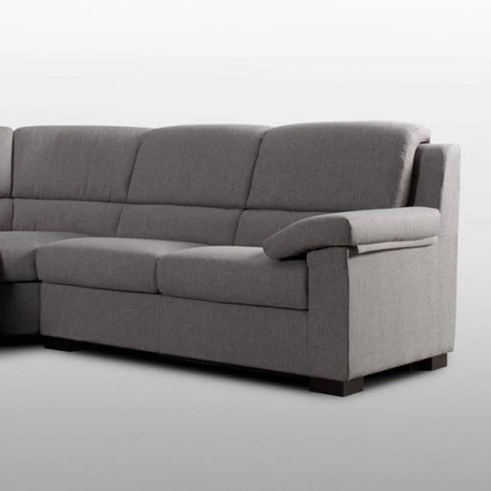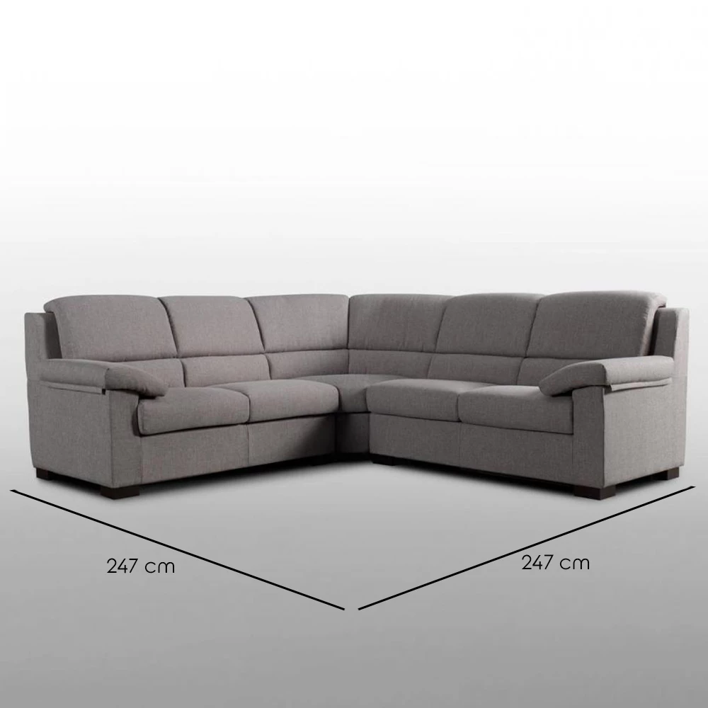 5-zits woonkamerbank volledig gemaakt in Italië met lichtgrijze stoffen bekleding en structuur in dennenhout en spaanplaat met polyurethaanvulling. De zit- en rugkussens hebben daarentegen een vulling van polyurethaanschuim met acrylvezel. Dit meubel bestaat uit twee zitbanken die met elkaar verbonden zijn door een ronde hoek .