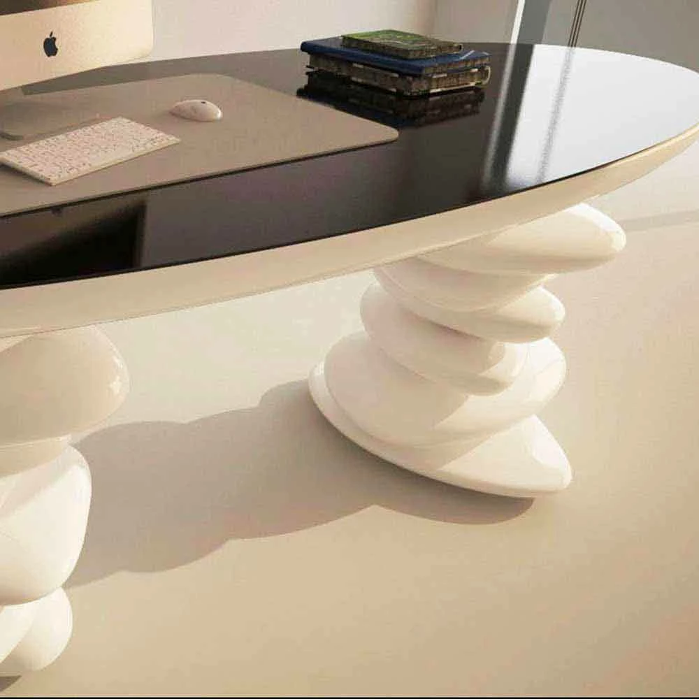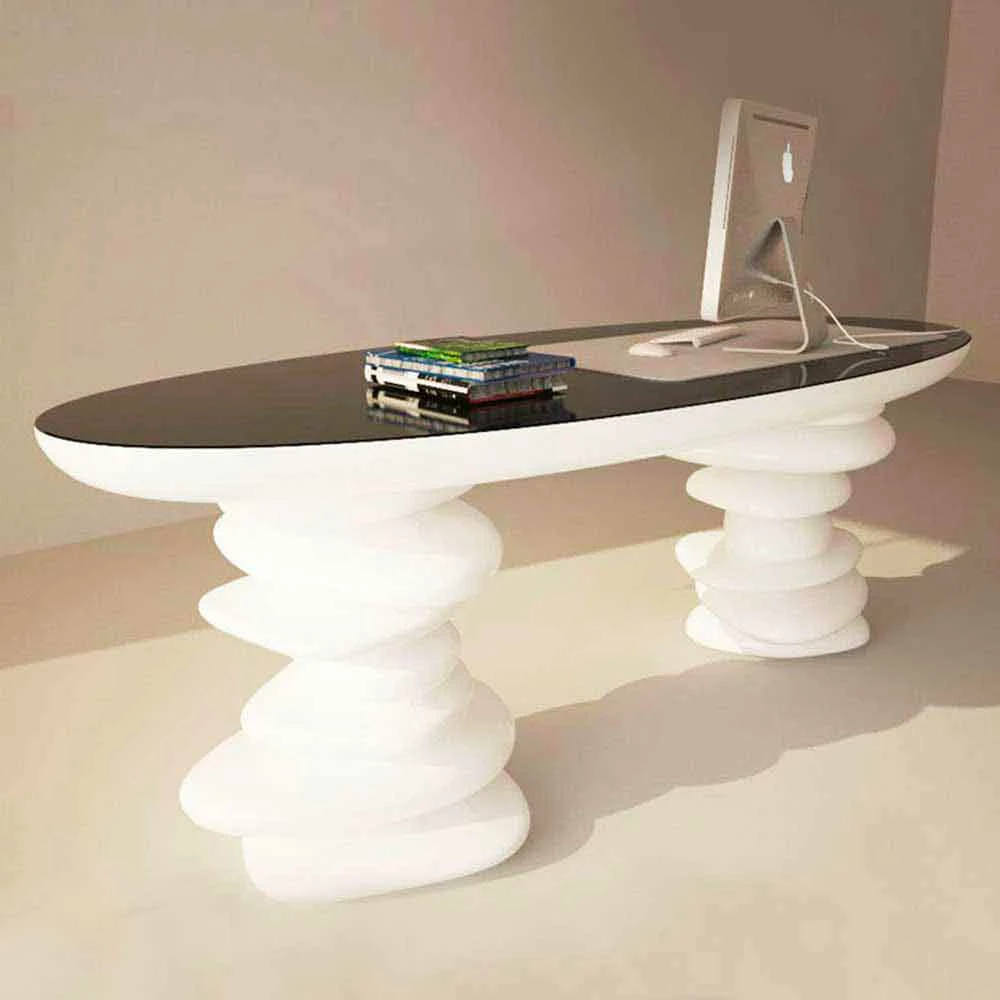 Het Aldington bureau kan niet alleen gebruikt worden als vergadertafel voor op kantoor, maar ook als eettafel of receptiebalie. De twee poten die het ondersteunen hebben de sterkte van overlappende stenen. Glanzende gelakte afwerking.