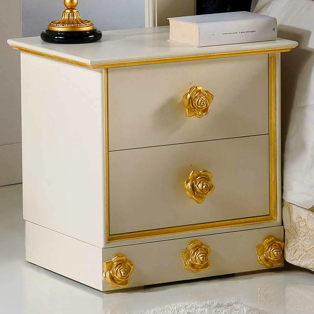 Het nachtkastje Renoir wordt gekenmerkt door een vakmanschap uitgevoerd met behulp van hoogwaardige materialen en het gebruik van de ervaring van geschoolde Italiaanse ambachtslieden. De structuur van hout en heeft 2 praktisch sluitingsmechanisme laden opgevangen. De knoppen hebben een frisse inrichting roos-vormig. crème gelakt met bladgoud ingelegde roos. Made in Italy.