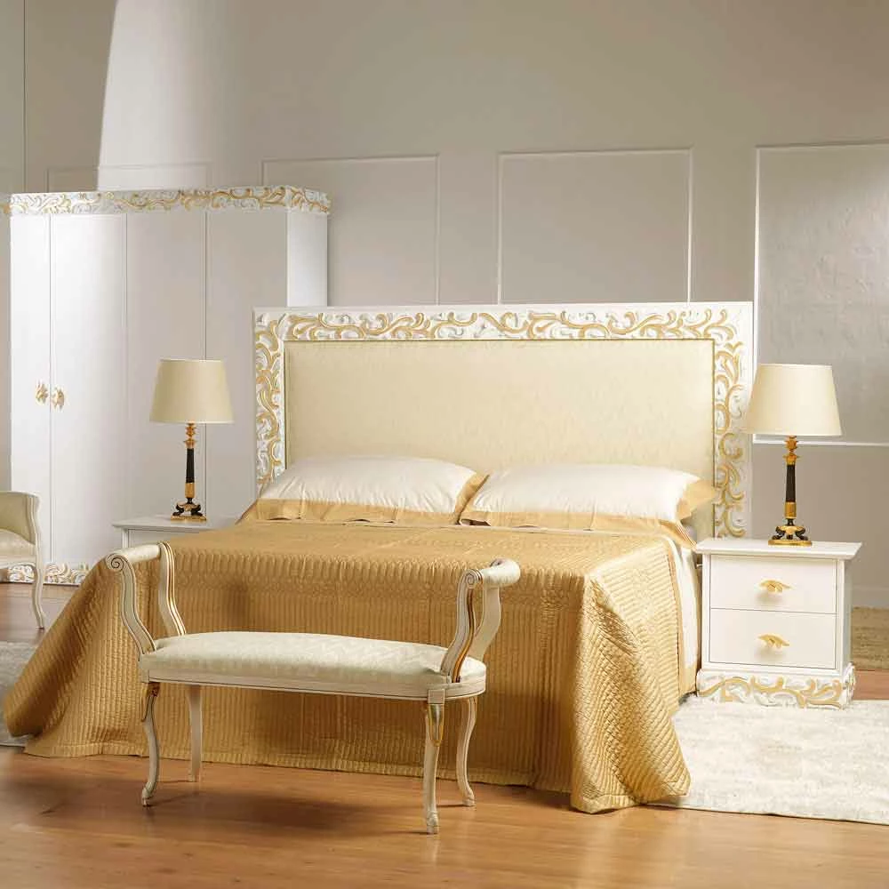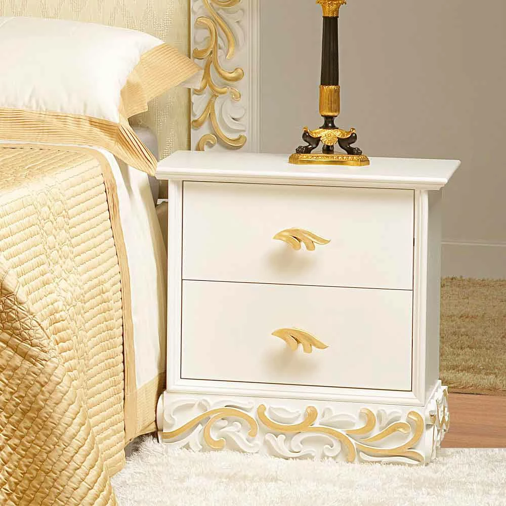 Het nachtkastje Kush wordt gekenmerkt door een vakmanschap uitgevoerd met behulp van hoogwaardige materialen en het gebruik van de ervaring van geschoolde Italiaanse ambachtslieden. De structuur van hout en is voorzien van 2 praktische laden met gedempte sluiting. ingelegde wit gelakt met bladgoud decoraties. Made in Italy.