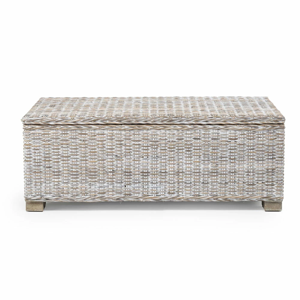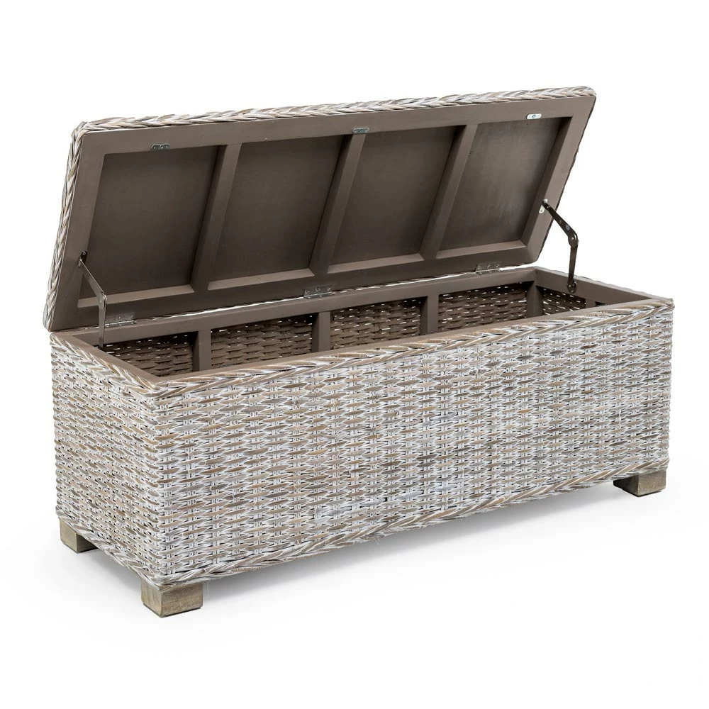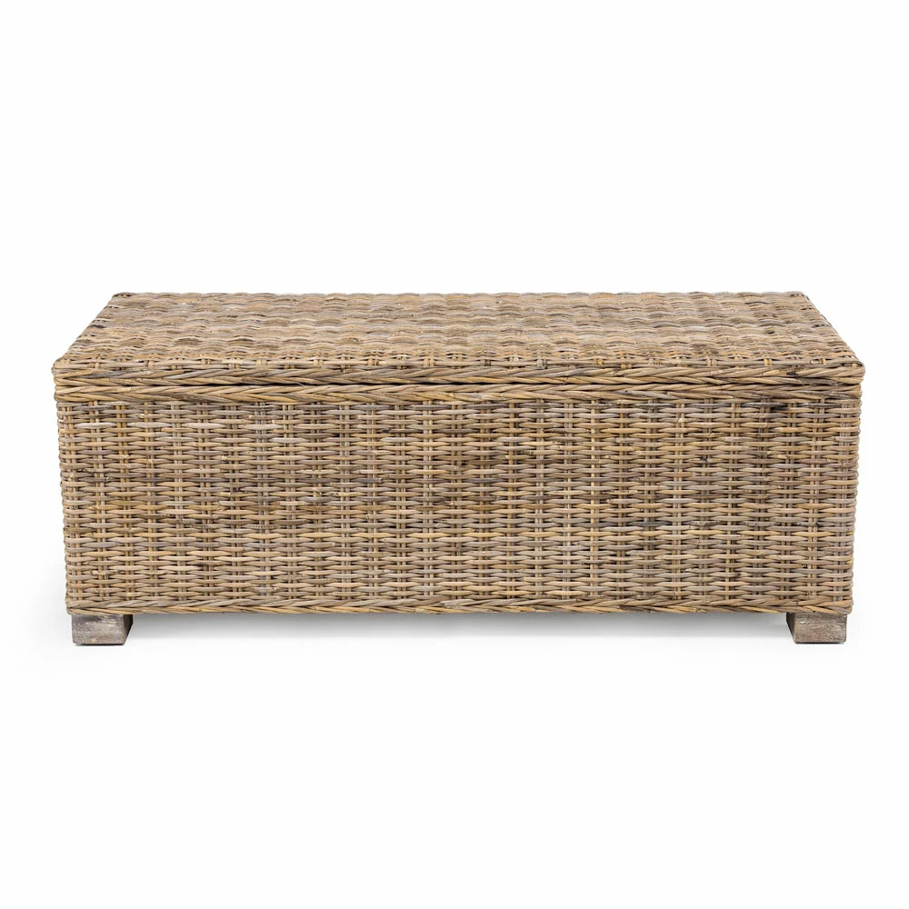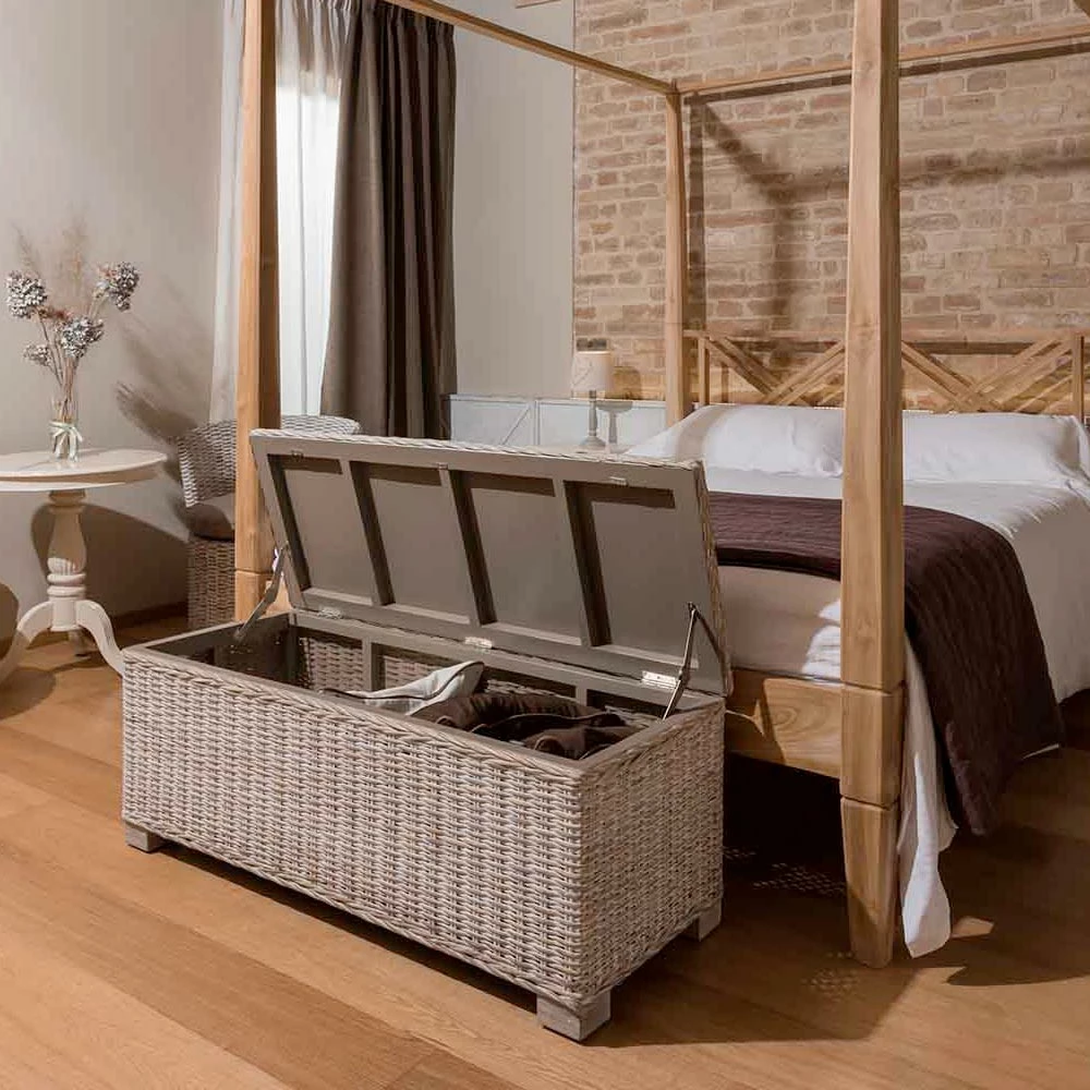 De kist behoort tot een hele collectie samengesteld uit stoelen en accessoires in natuurlijke vezels , met de hand geweven op massief houten frames.
