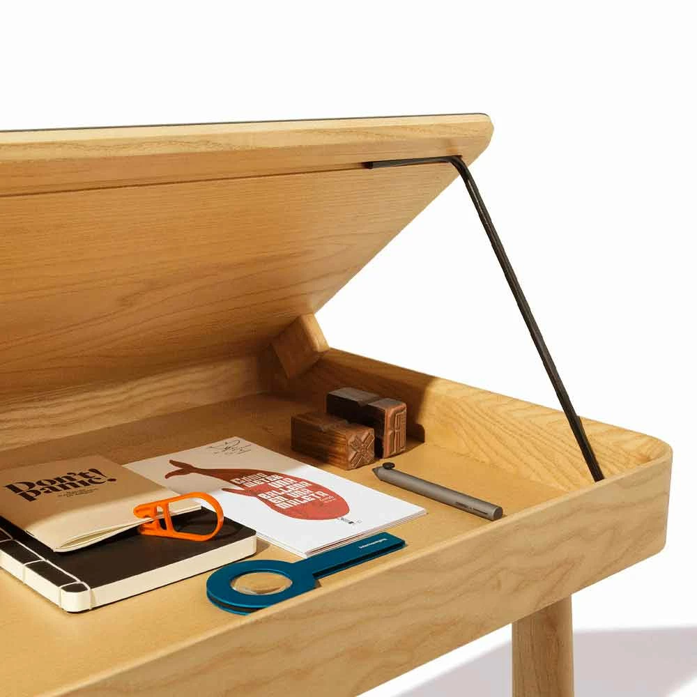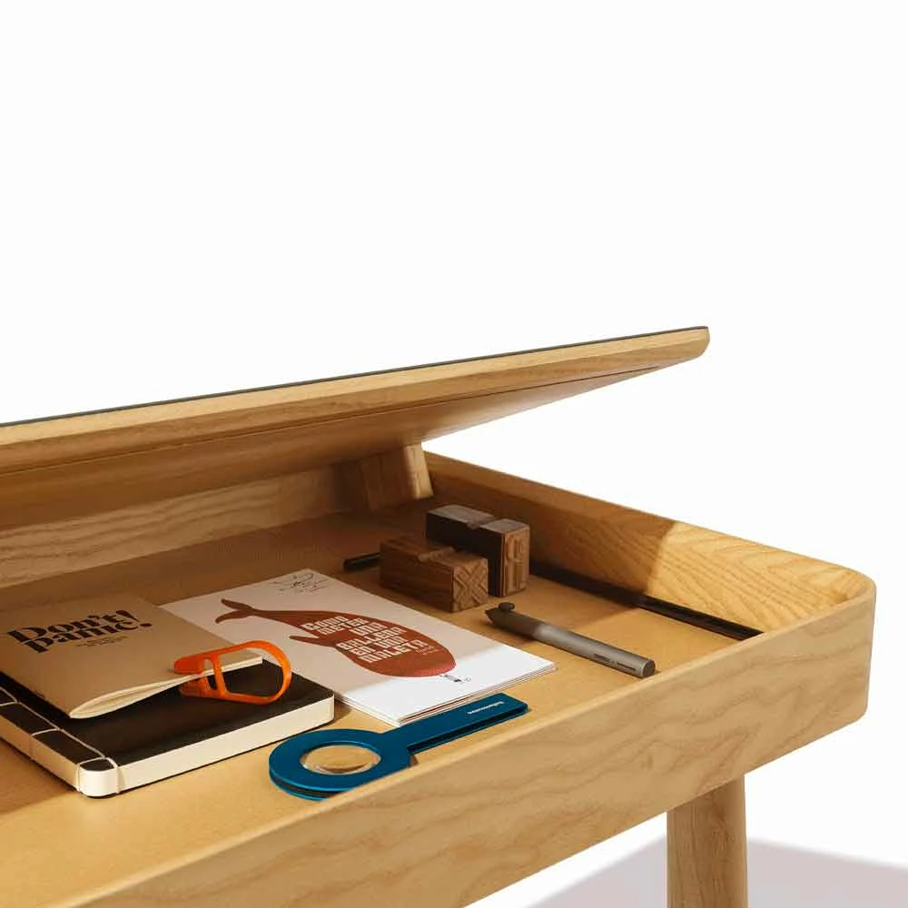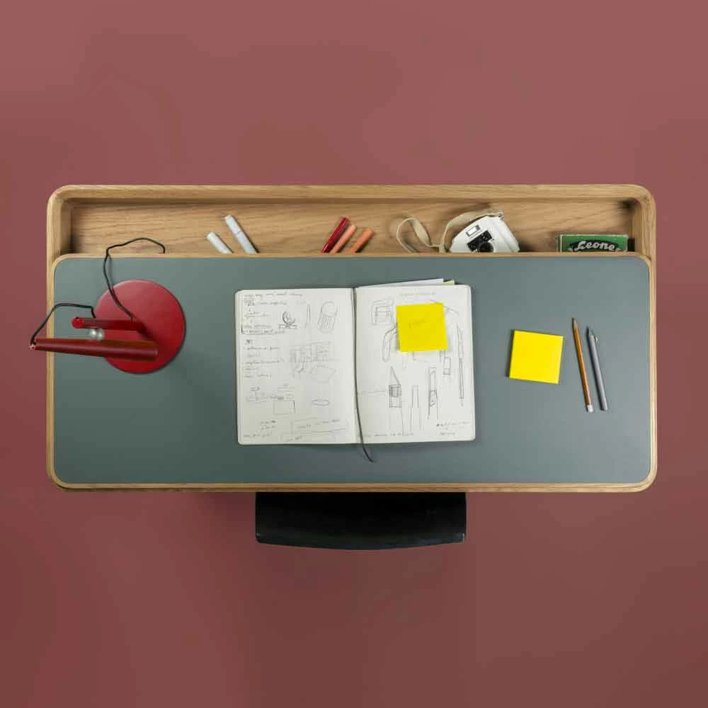 Bureau gemaakt in Italië met massief essenhouten structuur uitgerust met een vast opbergvak waarop een te openen blad is geplaatst, bedekt met petroleumgroen linoleum, dat naar wens kan schuiven, afhankelijk van de actie en het gebruik ervan. Met een eenvoudig gebaar is het mogelijk om documenten op te bergen en te ordenen, pennen of andere accessoires die in het compartiment worden bewaard, wat een herinterpretatie en een innovatief alternatief voor de meer klassieke lade vertegenwoordigt. De bovenkant schuift op groeven van 45 ° die verschillende positionering, zelfcentrering en schuiven mogelijk maken, waardoor het tegelijkertijd de hoge kwaliteit van de materialen waarneemt die voor de realisatie zijn gekozen. Samen met de sterke functionele kant heeft dit bureau een exclusief ontwerp dat wordt gekenmerkt door zachte en essentiële lijnen en vormen die de esthetiek van het product op een sobere en moderne manier verrijken voor een resultaat dat uw huisruimtes kan voltooien en alle elegantie met zich meebrengt . van hout en zijn prachtige nerf.