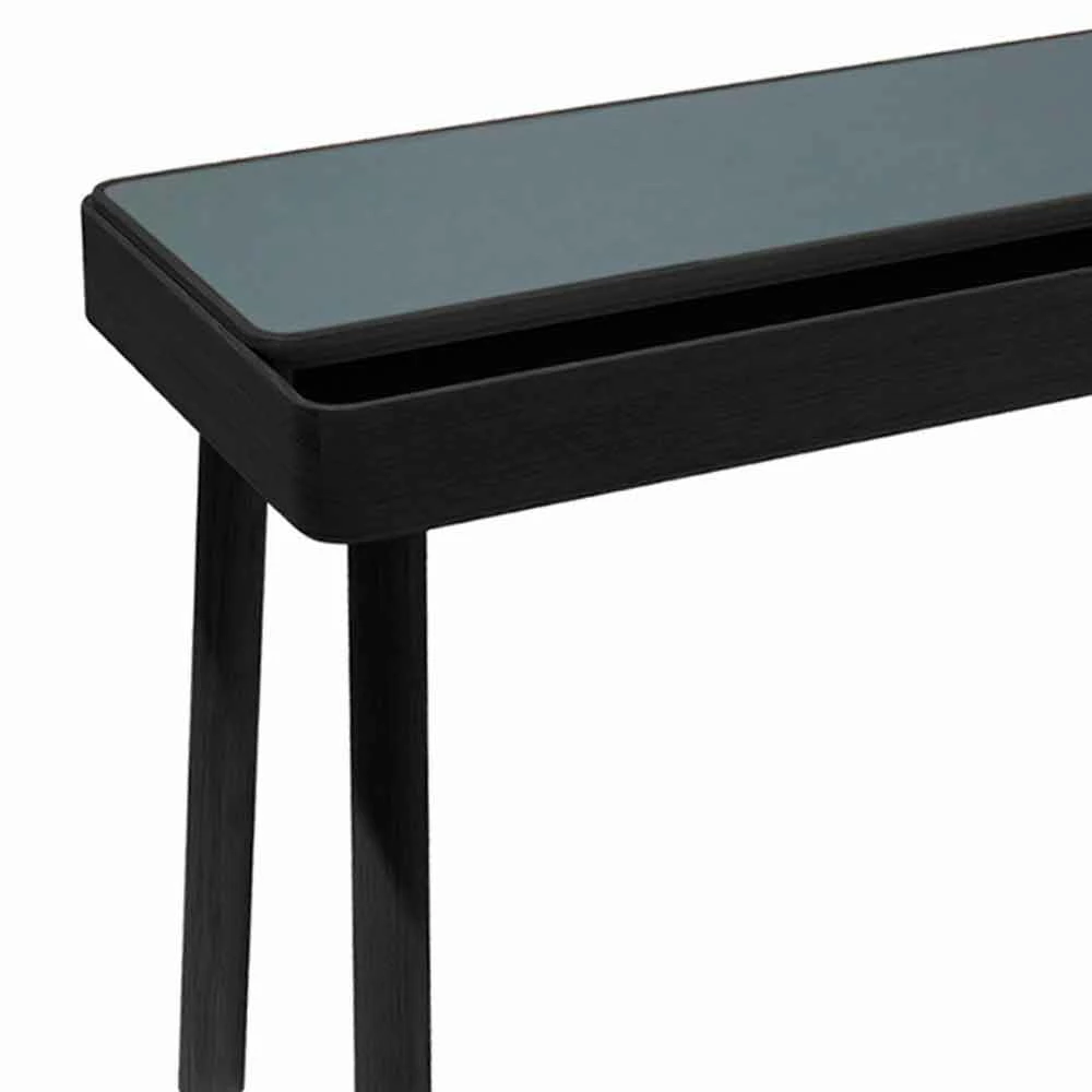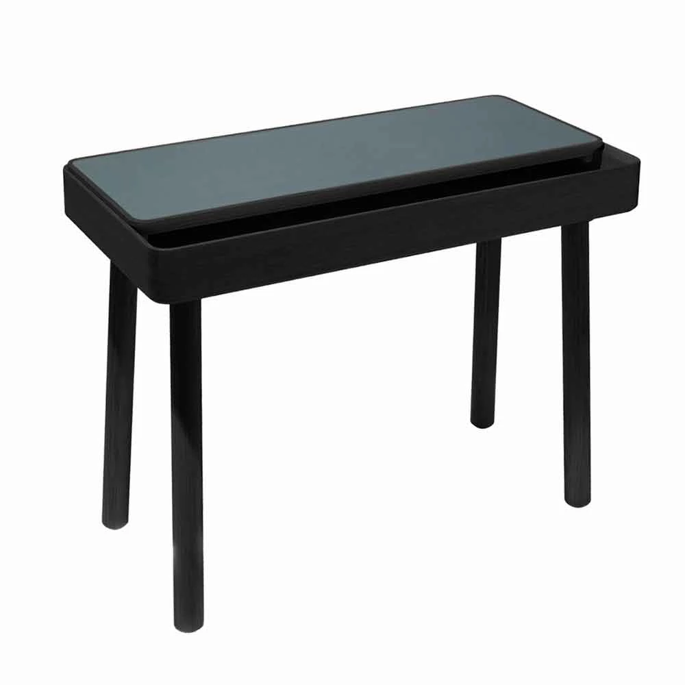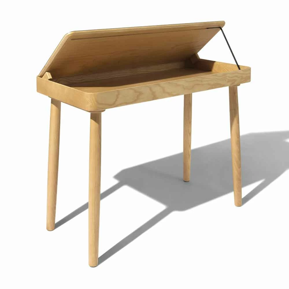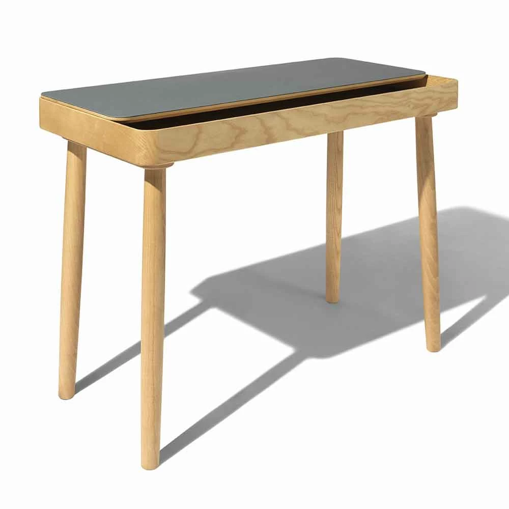 Bureau gemaakt in Italië met massief essenhouten structuur uitgerust met een vast opbergvak waarop een te openen blad is geplaatst, bedekt met petroleumgroen linoleum, dat naar wens kan schuiven, afhankelijk van de actie en het gebruik ervan. Met een eenvoudig gebaar is het mogelijk om documenten op te bergen en te ordenen, pennen of andere accessoires die in het compartiment worden bewaard, wat een herinterpretatie en een innovatief alternatief voor de meer klassieke lade vertegenwoordigt. De bovenkant schuift op groeven van 45 ° die verschillende positionering, zelfcentrering en schuiven mogelijk maken, waardoor het tegelijkertijd de hoge kwaliteit van de materialen waarneemt die voor de realisatie zijn gekozen. Samen met de sterke functionele kant heeft dit bureau een exclusief ontwerp dat wordt gekenmerkt door zachte en essentiële lijnen en vormen die de esthetiek van het product op een sobere en moderne manier verrijken voor een resultaat dat uw huisruimtes kan voltooien en alle elegantie met zich meebrengt . van hout en zijn prachtige nerf.
