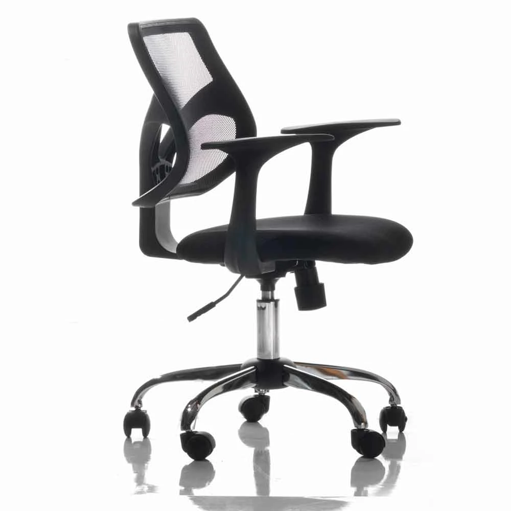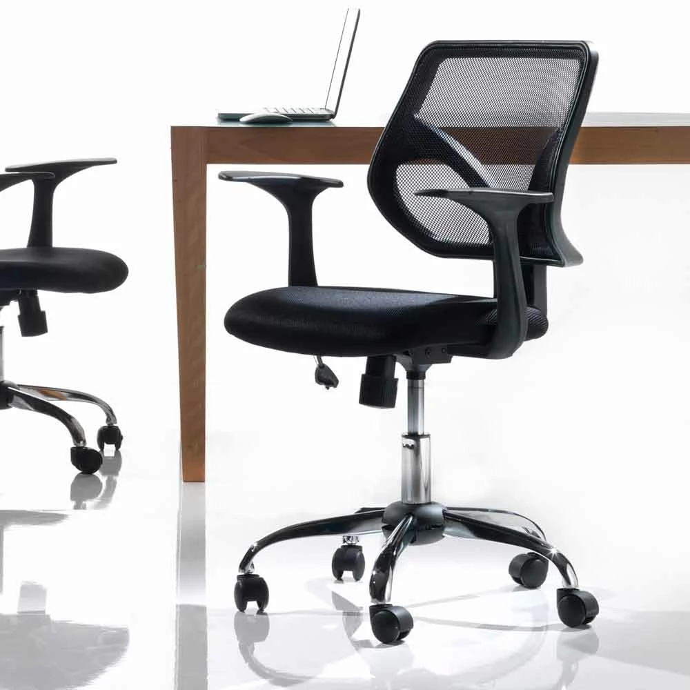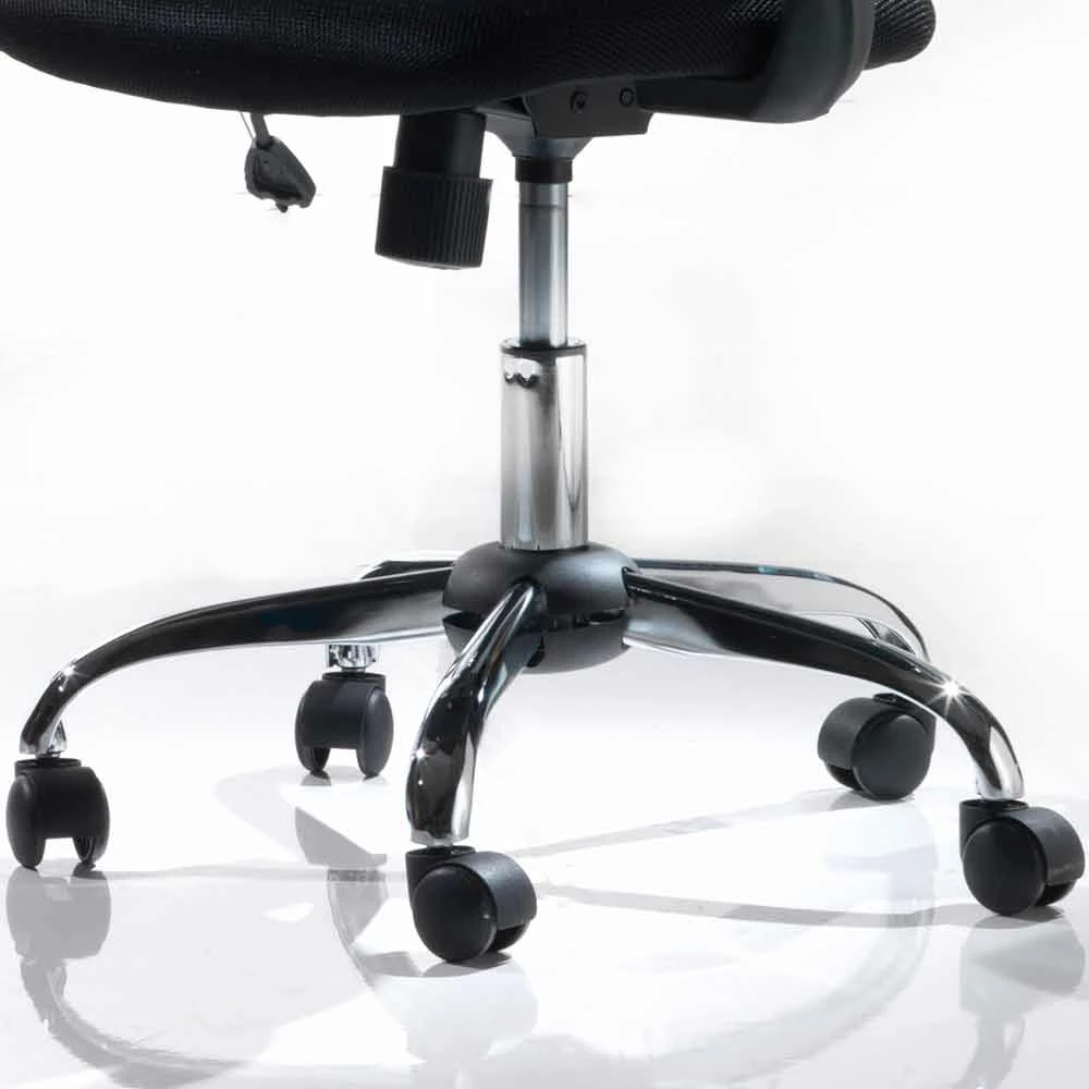 De bureaustoel Giovanna is ideaal om de gebruiker bewegingsvrijheid en maximaal comfort te bieden; het wordt geleverd met een draaibare stoel met gaslift, verchroomde metalen structuur met polyurethaan wielen; zitting bekleed met zwarte puma en rug in zwarte micro-geperforeerde technorete.