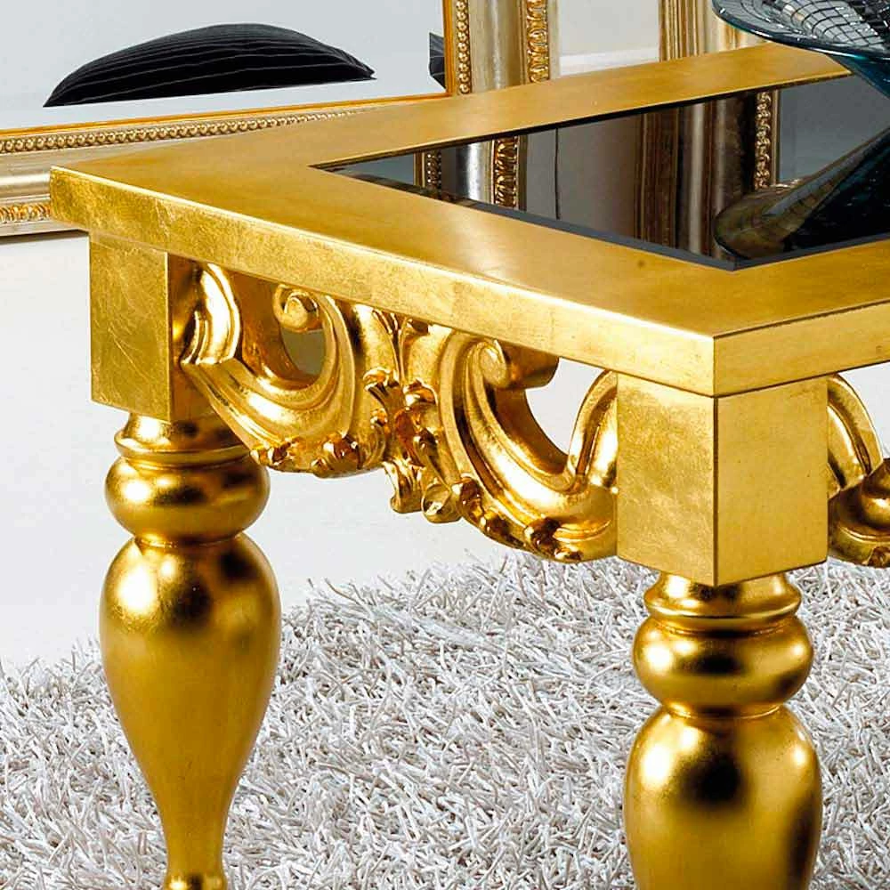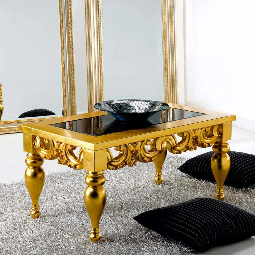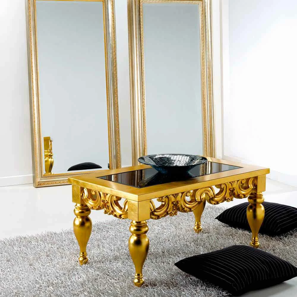 De tabel Lof wordt gekenmerkt door een vakmanschap uitgevoerd met hoogwaardige materialen en het gebruik van de ervaring van geschoolde Italiaanse ambachtslieden. De structuur is gemaakt van hout met ingelegde decoraties. antiek bladgoud finish. Top in zwart glas. Made in Italy.