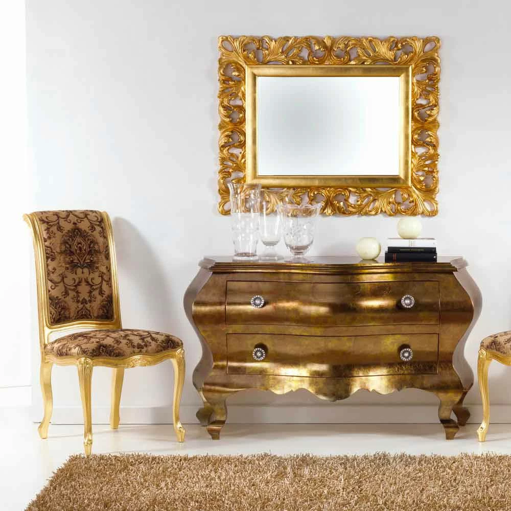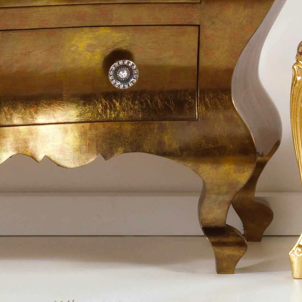 Deze commode is ideaal voor liefhebbers van de inrichting van klassieke en retro stijl. 2 laden zijn vervaardigd van gevormd massief hout en hebben knoppen in kristal. brons blad finish. Vakmanschap volledig in Italië vervaardigd. Ook verkrijgbaar in wit, goud en zilver.