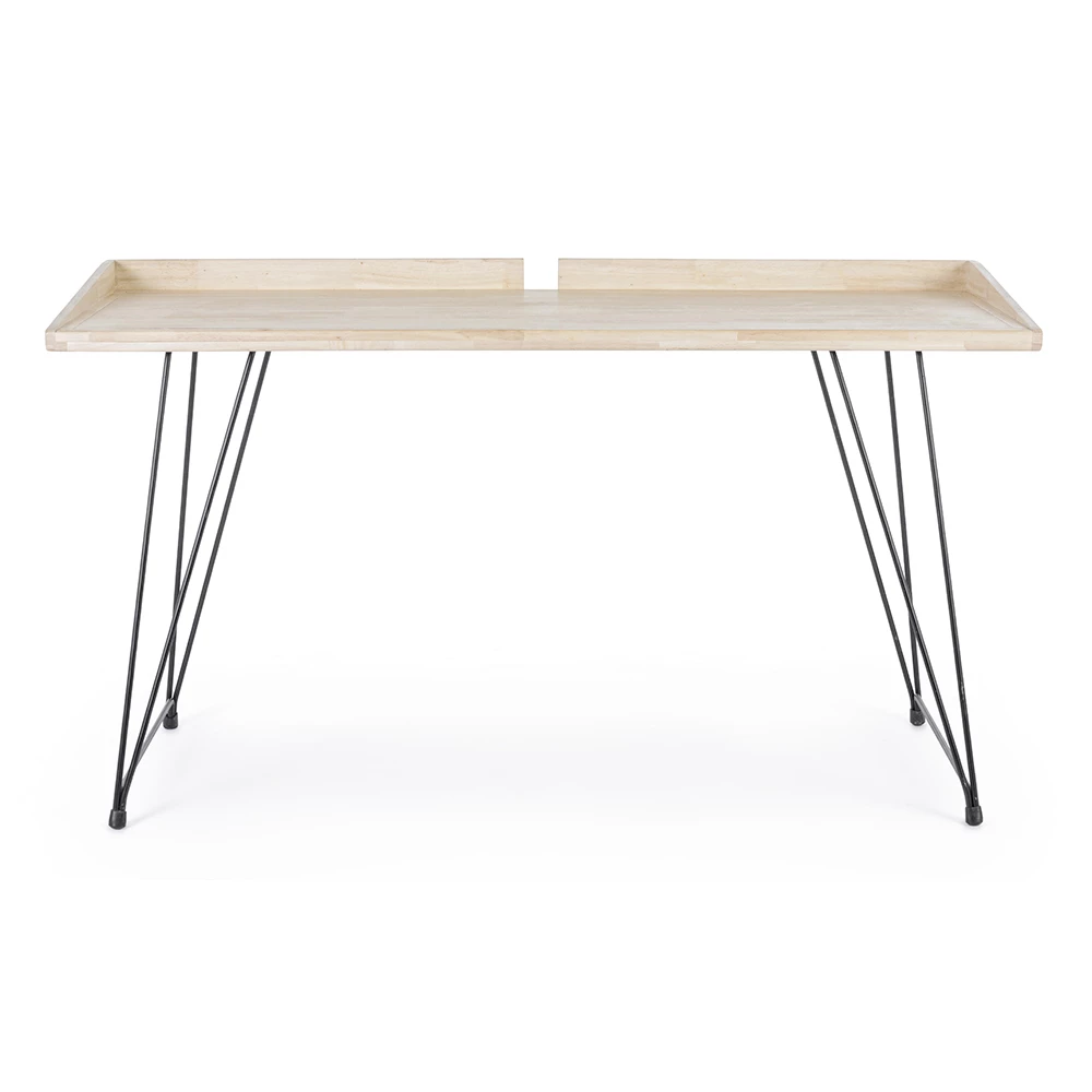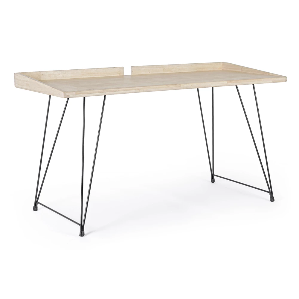 Dit bureau of slaapkamerbureau heeft stalen poten met epoxypoedercoating en een blad van rubberhout met een wasafwerking.