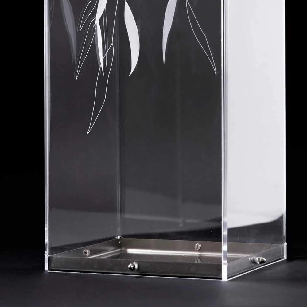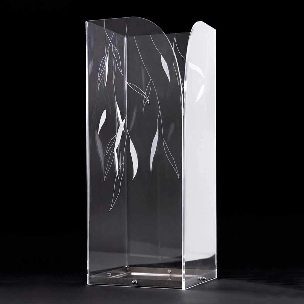 De paraplubak van transparant plexiglas kenmerkt zich door de lasergemarkeerde decoraties van bladeren en voet in roestvrij staal.