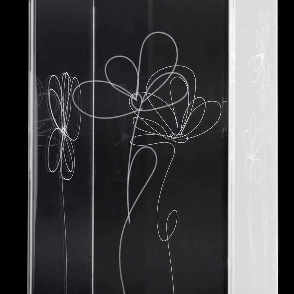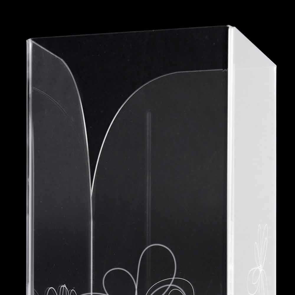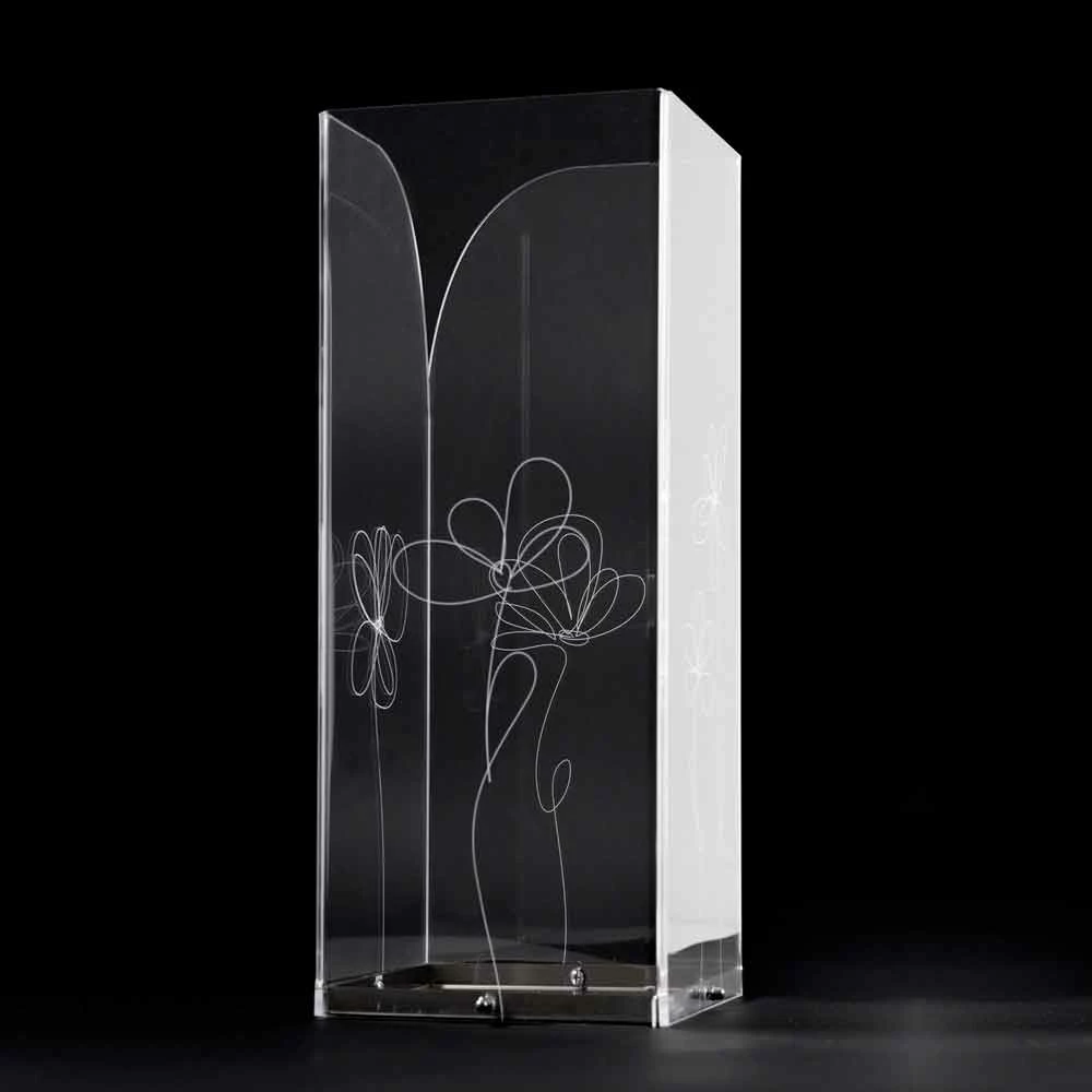 Paraplubak van transparant plexiglas dat wordt gekenmerkt door laser-gemarkeerde bloemendecoraties met een gestileerde stijl met roestvrijstalen voet.