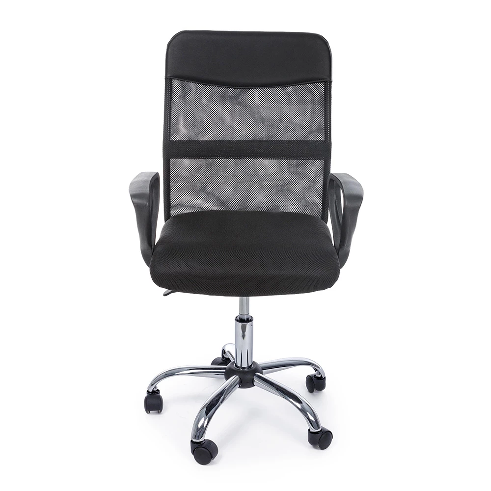 Draaibare bureaufauteuil in staal en zwarte netstof met armleuningen.
