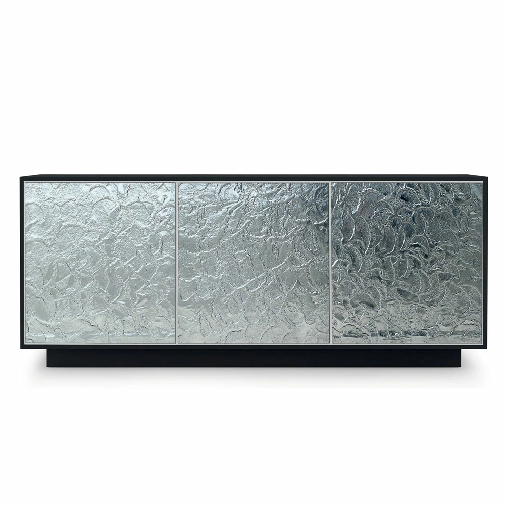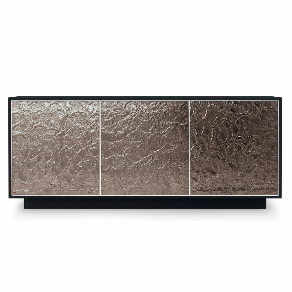 Dressoir van mat zwart gelakt hout met Made in Italy bewerkte glazen deuren.