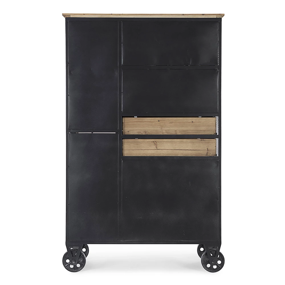 Dressoir van staal en grenenhout met wielen, industrieel design.