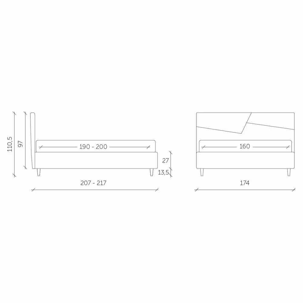 Het hoofdeinde wordt gekenmerkt door drie geometrische en gewatteerde panelen die het esthetische aspect benadrukken; het is niet verwijderbaar. Het bedframe is afneembaar.