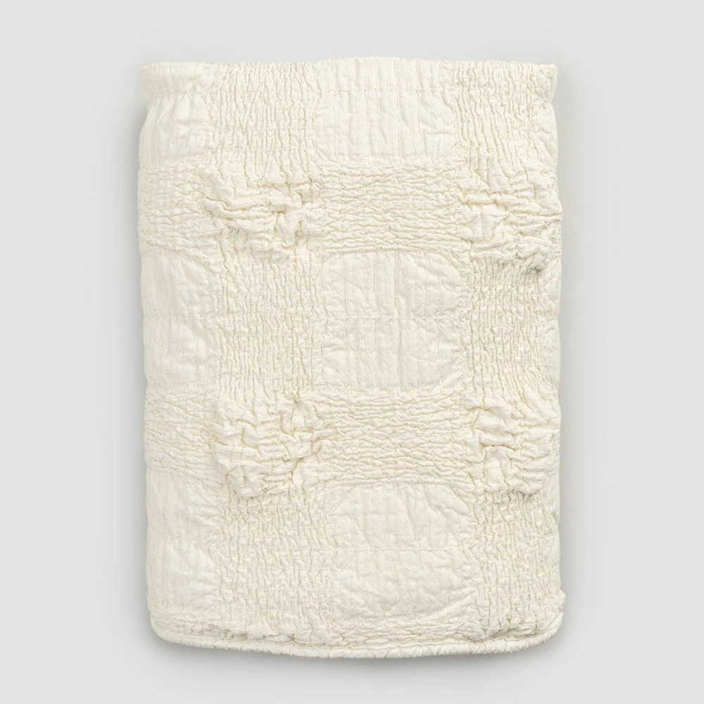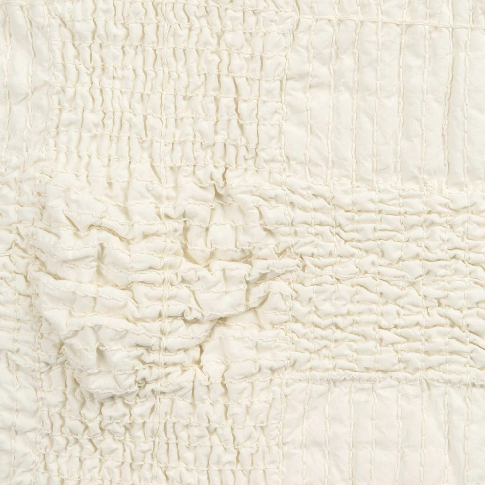 De waarde van traditie voegt zich bij de moderne levensstijl met deze lichtbeige katoenen tweepersoons sprei met ‘gestreept’ stretchborduursel en volantrand.