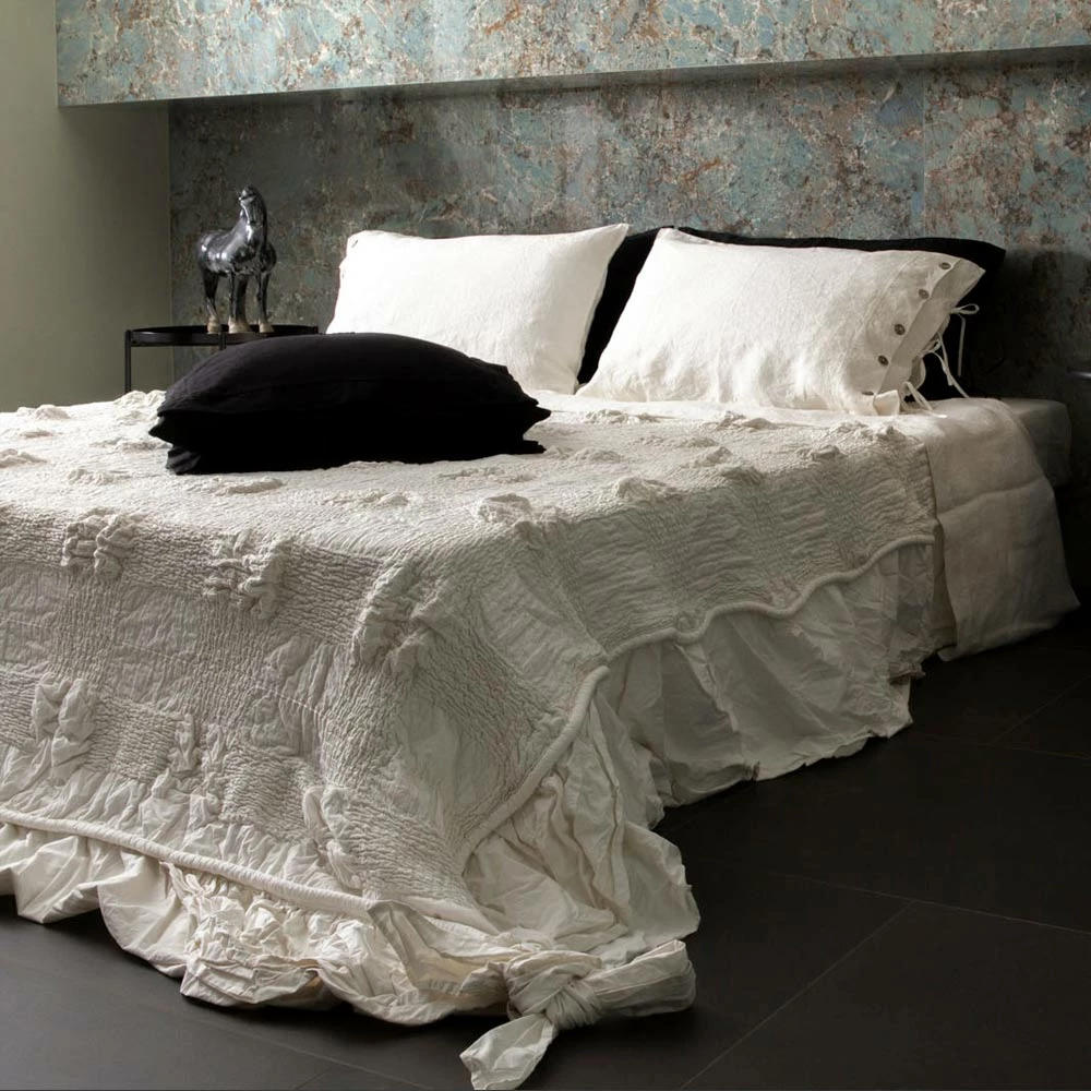 De sprei wordt geproduceerd in Italië en gemaakt van 100% hoogwaardig linnen en voelt zacht aan dankzij speciale behandelingen die de natuurlijke uitstraling versterken. Ideaal voor het bed omdat het hypoallergeen en antibacterieel is , dankzij het gebruik van natuurlijke en hypoallergene kleurstoffen die glans en zwier geven.