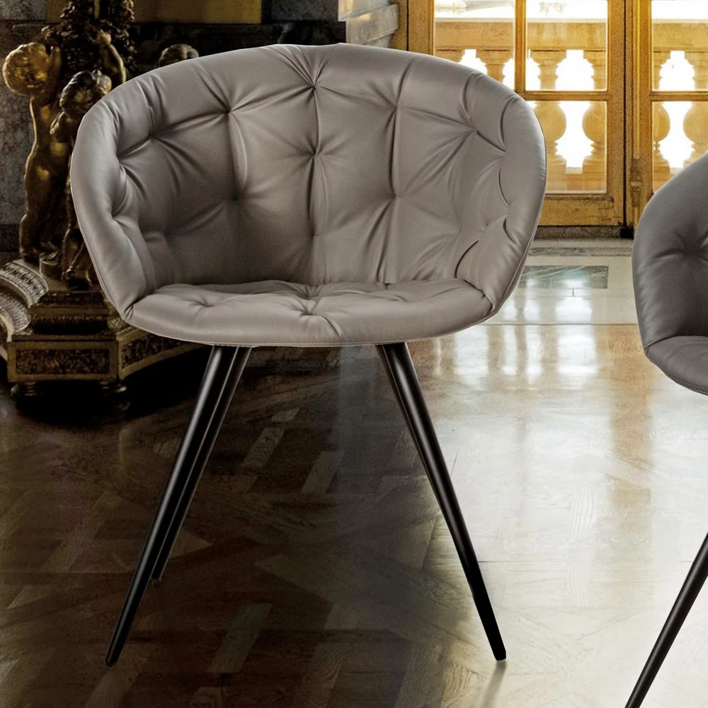 Moderne en elegante stoel voor eetkamer of keuken met zitting bekleed met doorgestikt eco – leer en poten in zwart geverfd metaal . Het ontwerp is bedacht en gemaakt om comfort en een heerlijk gevoel van ontspanning te garanderen, elementen die worden verleend door de ronde vorm die leven geven aan een uiterst gastvrije stoel. Het bijzondere vakmanschap in combinatie met het gebruik van eco-leer geeft ook een gevoel van tijdloze verfijning die, in combinatie met de meer eigentijdse toets van de metalen basis, een stoel creëert die moderniteit en een vintage look kan omsluiten, waardoor hij in elk interieur kan worden geplaatst stijl.