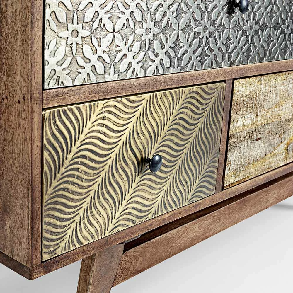 De eigenaardigheid wordt gegeven door het frontoppervlak van de 7 laden gemaakt van gerecycled mango- en acaciahout met applicaties in metaal en leer met een verfafwerking op waterbasis.