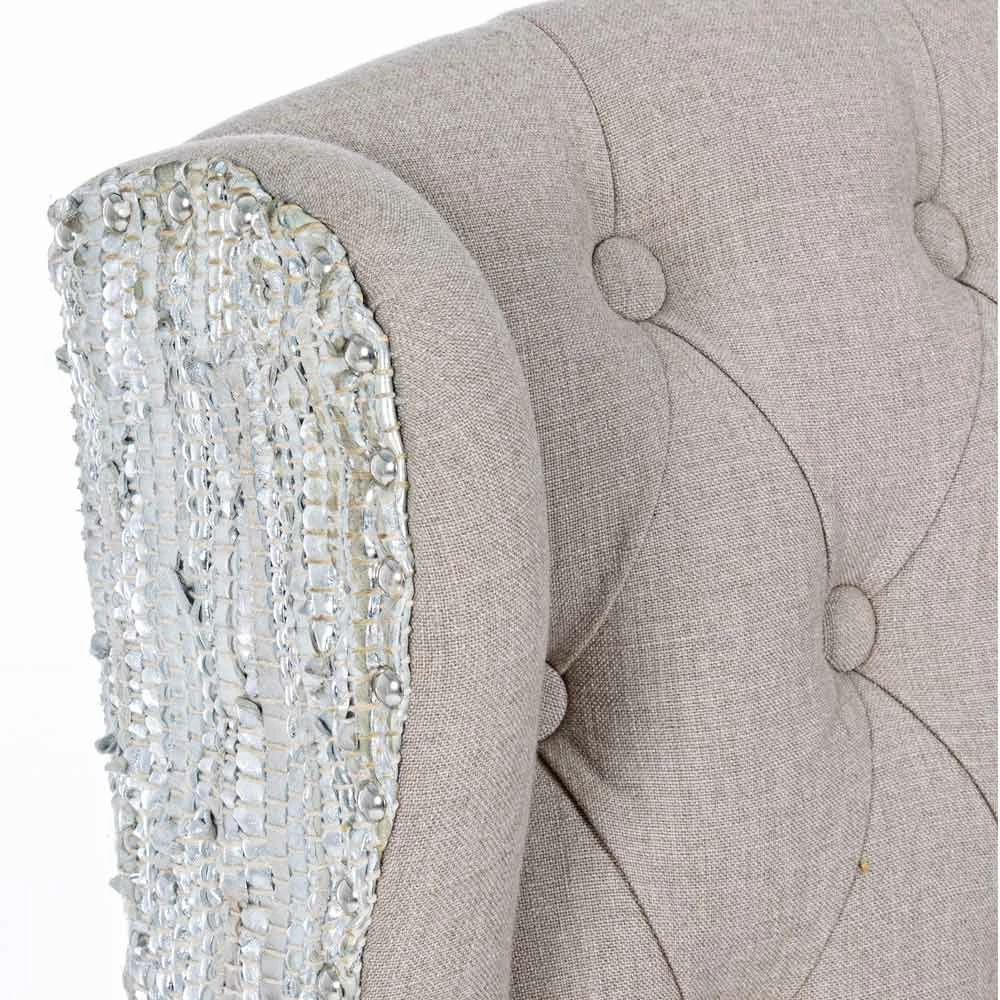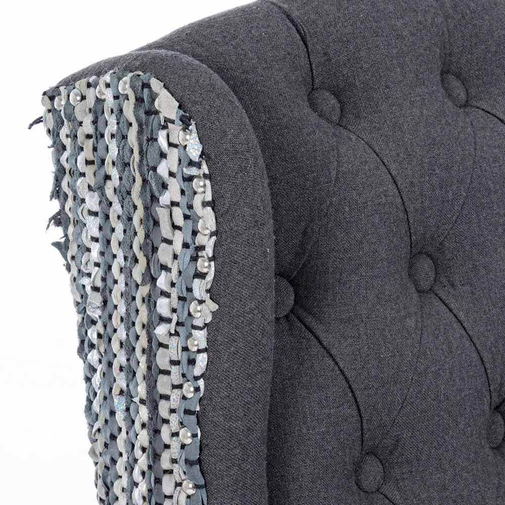 - bekleding in polyester, linneneffect en gerecycled leer met applicatie van metal studs.