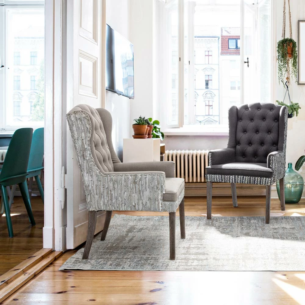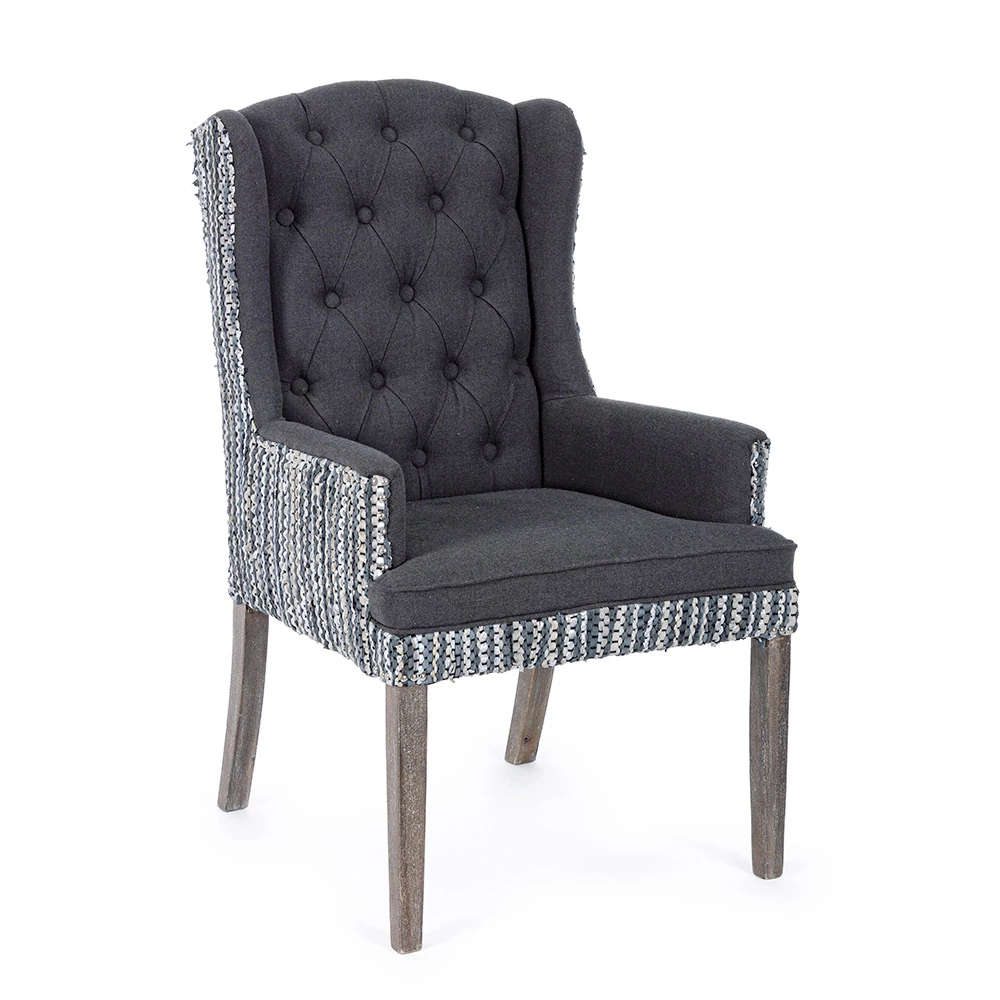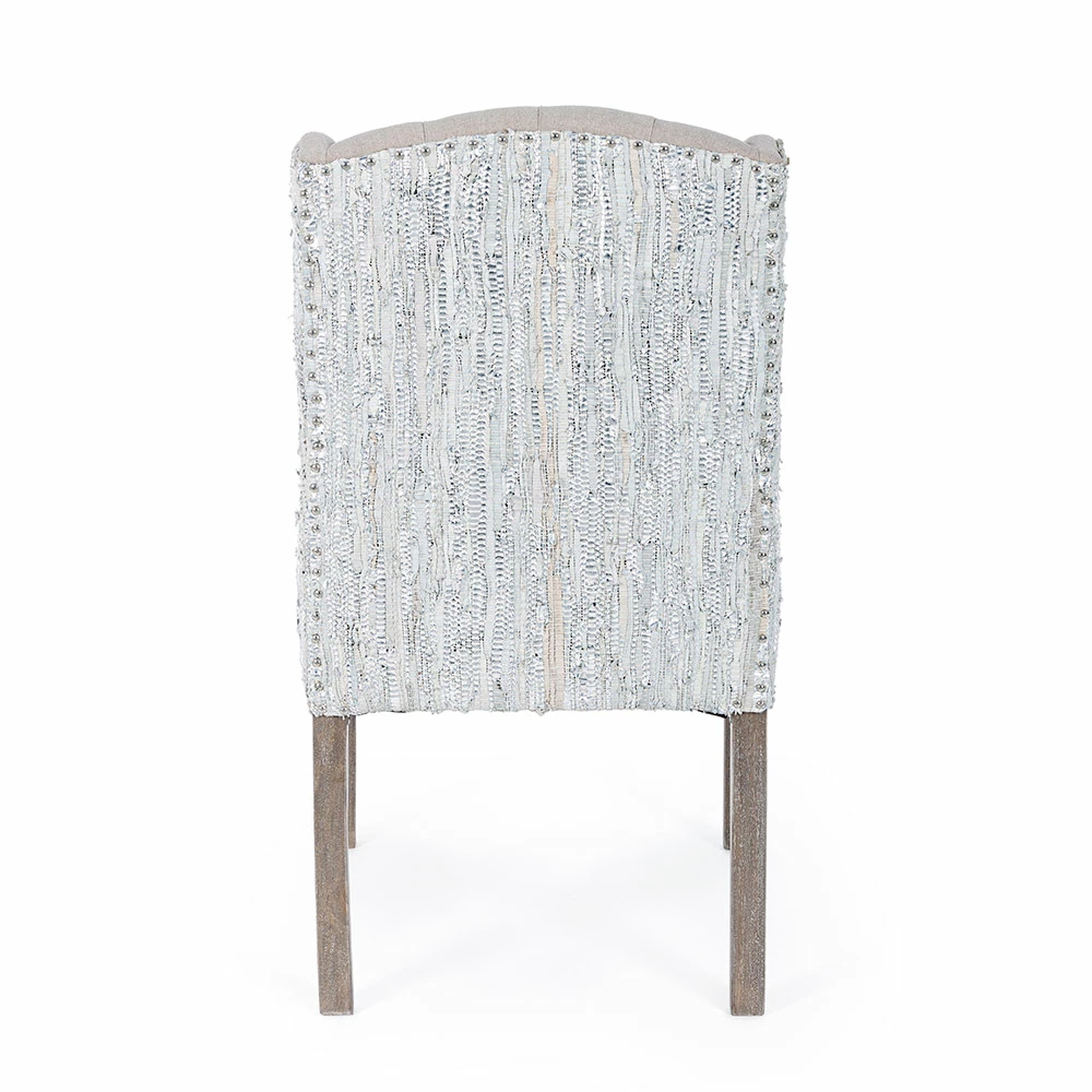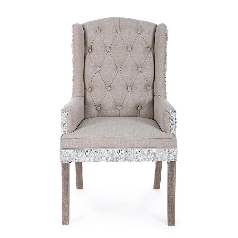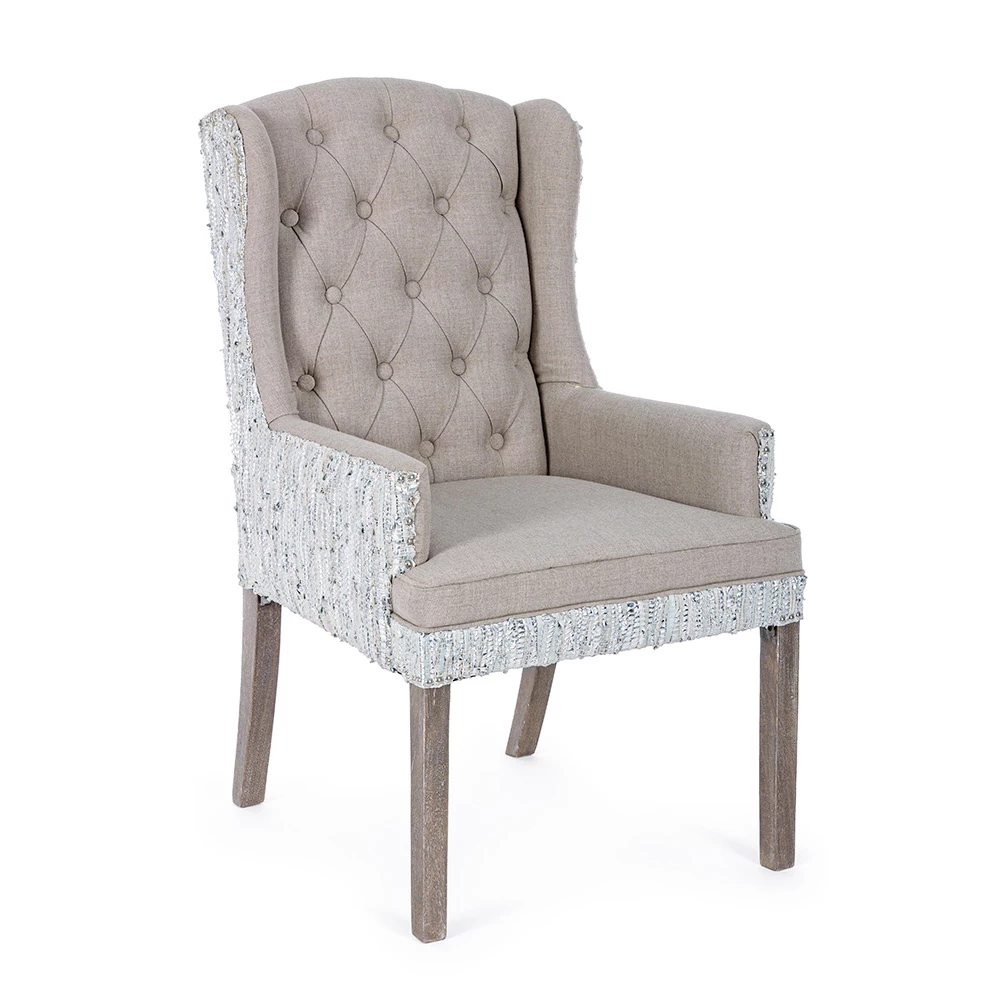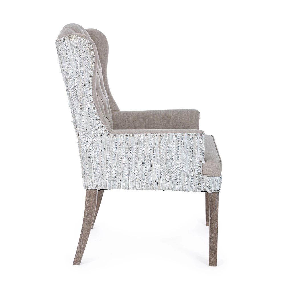 Fauteuil in mangohout en zitting met linneneffect en gerecycleerd leer met 2 afwerkingen.