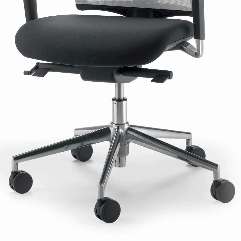 Een andere bijzonderheid van Mina is ingesloten in de hoogte verstelbare armleuningen met drukknop, met een 70 mm slag werking schuift voorwaarts / achterwaarts en breedte (3D), van gepolijst gegoten aluminium, compleet met boven- en kunststofdelen PA6 nylon gevuld met 15% glasvezel zwarte afwerking, compleet met top PU-zwarte kleur.