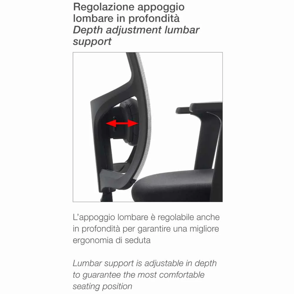 De lendensteun is gevoerd en bekleed en in diepte voor een betere en meer nauwkeurige ondersteuning van de stippellijn een verbeterde ergonomie van de stoel verstelbaar.