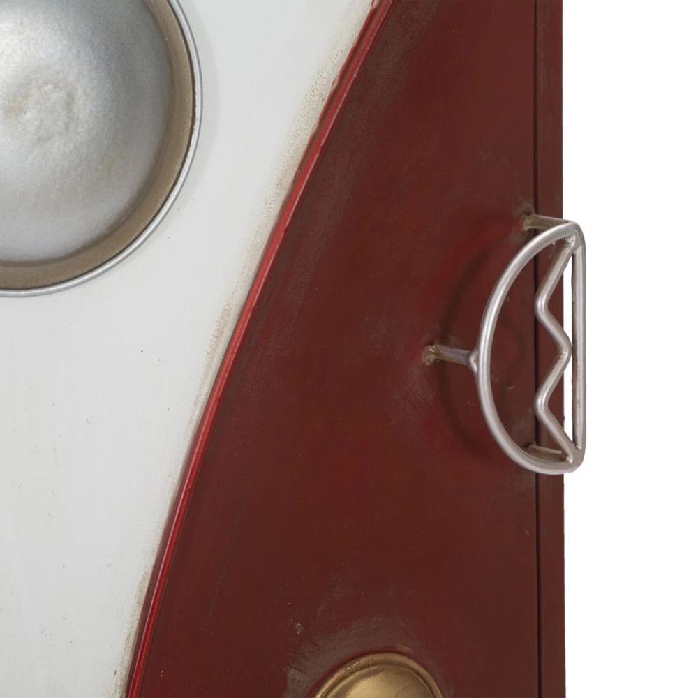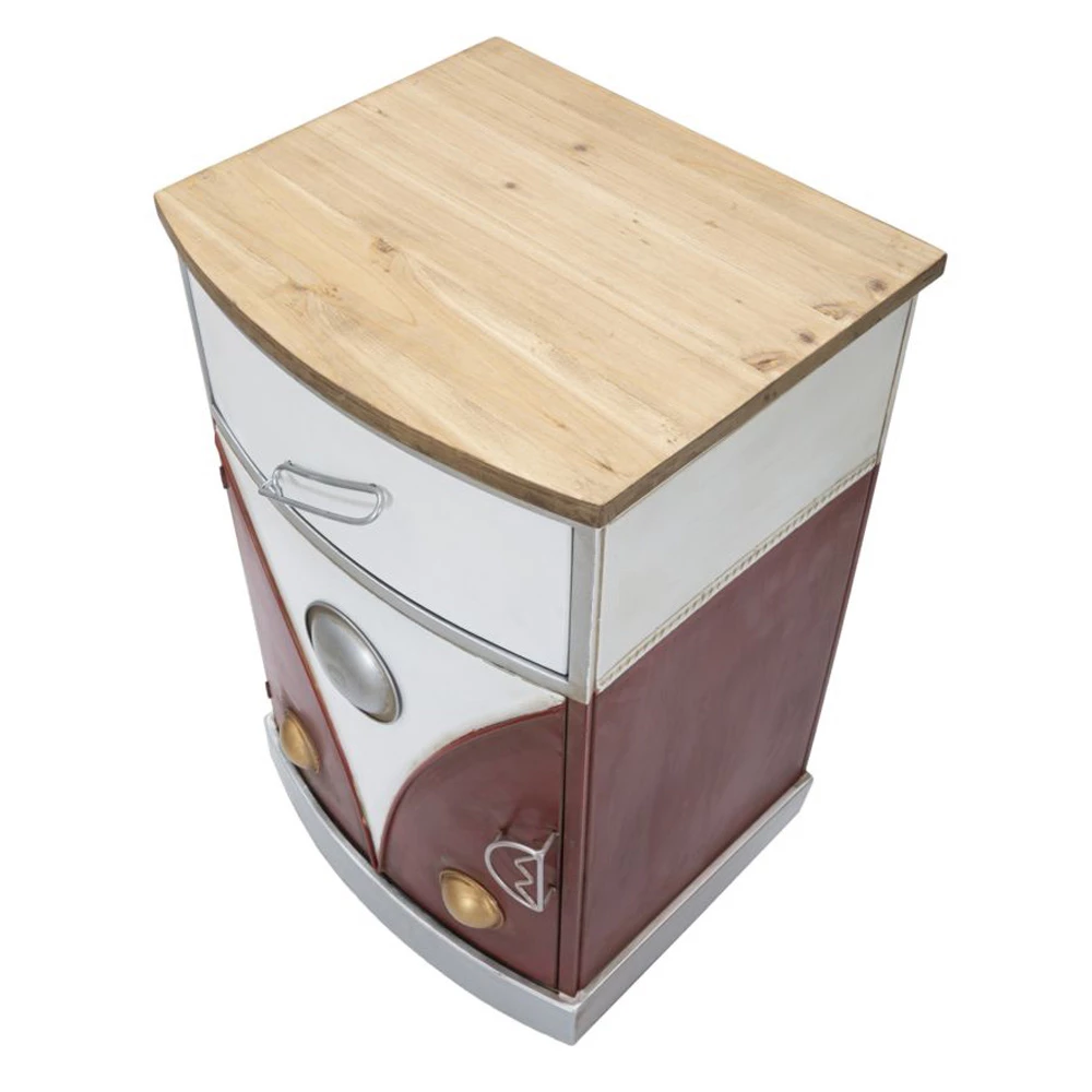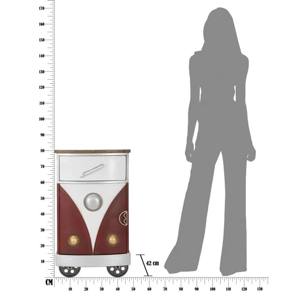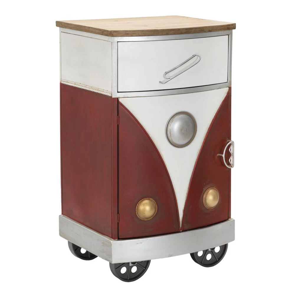 Nachtkastje van dennenhout, mdf en ijzer compleet met wieltjes met lade en deurtje waarbinnen een praktische plank zit. Een bijzonder origineel en creatief meubelstuk dankzij het ontwerp dat de hele structuur bedekt en het ontwerp van een kleine en kleurrijke bestelwagen reproduceert. Een uniek decoratief element ontworpen voor diegenen die hun huis graag inrichten met objecten met een sterke persoonlijkheid en een excentriek karakter, die de omgeving nieuw leven inblazen.