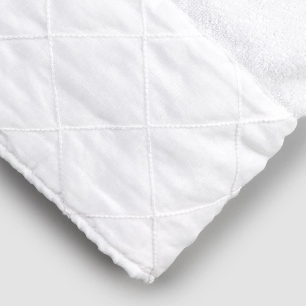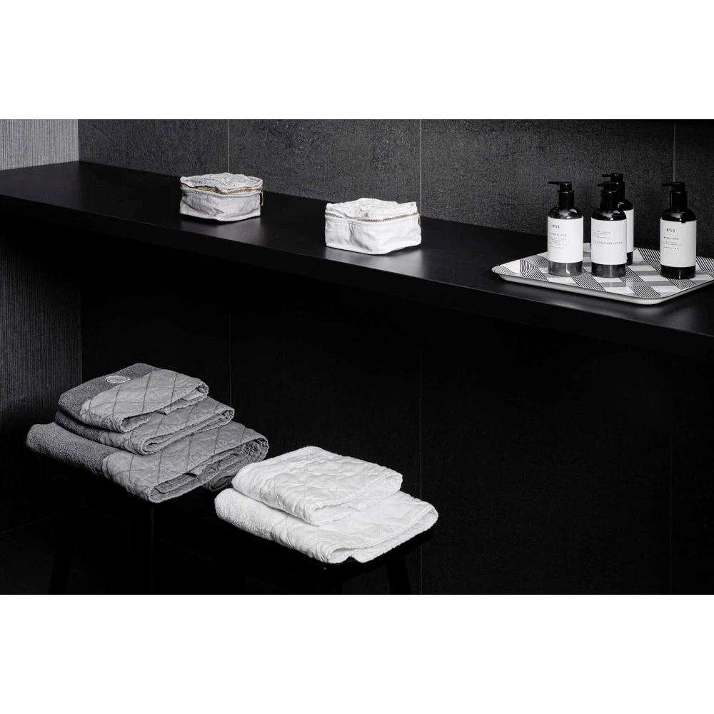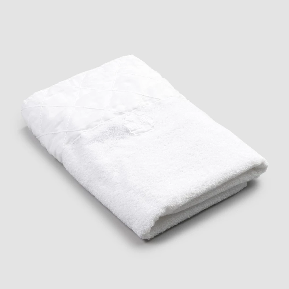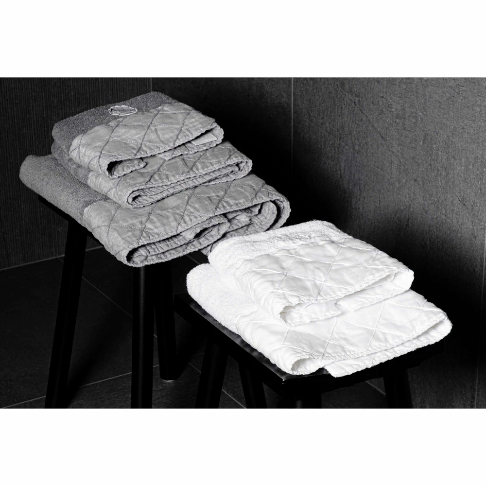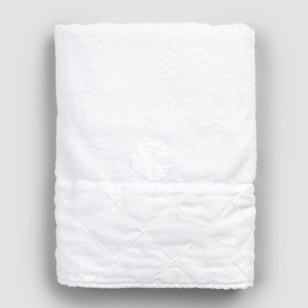 Witte katoenen badstof handdoek met luxe geometrische decoratie gemaakt in Italië.