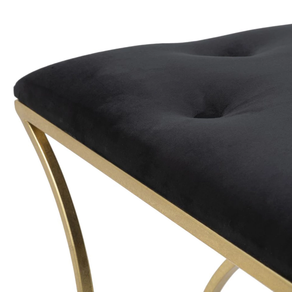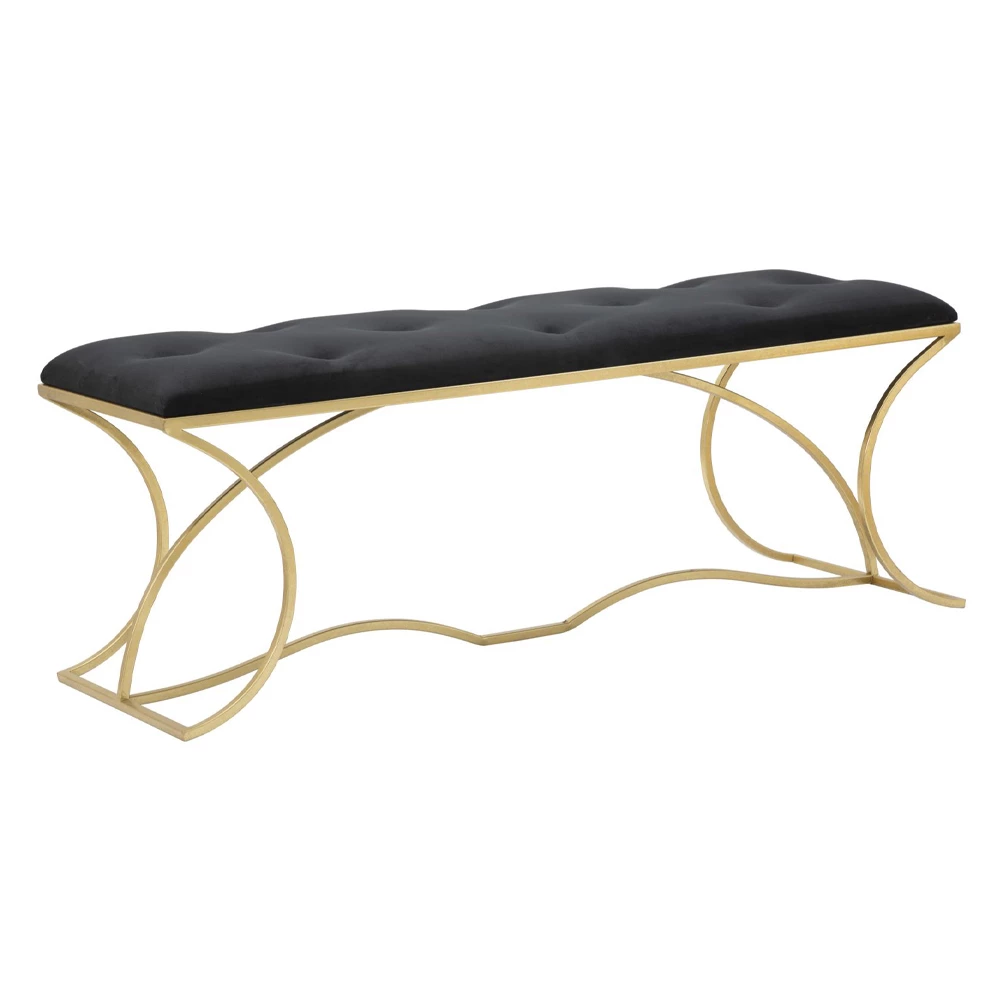 Moderne bank in verguld ijzer met gewatteerde zitting bedekt met zwarte stof.