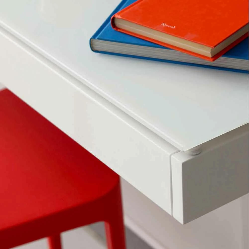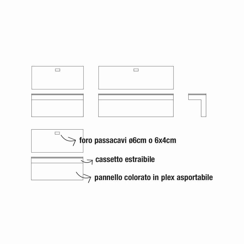 Een aanvulling waarvan de esthetiek het concept van functionaliteit volledig tot uitdrukking brengt en een ideale oplossing biedt voor zowel huiselijke omgevingen als echte kantoren. Het frontpaneel samen met het kabelgat zorgen ervoor dat je draden, stopcontacten en wifi-stations kunt verbergen, waardoor je een schoon en overzichtelijk resultaat krijgt. De gebruikte materialen creëren een avant-gardistisch ontwerp dat de elegantie van kristal combineert met de moderniteit van geverfd metaal en plexiglas om een innovatief, eenvoudig en uiterst veelzijdig inrichtingsidee te creëren.
