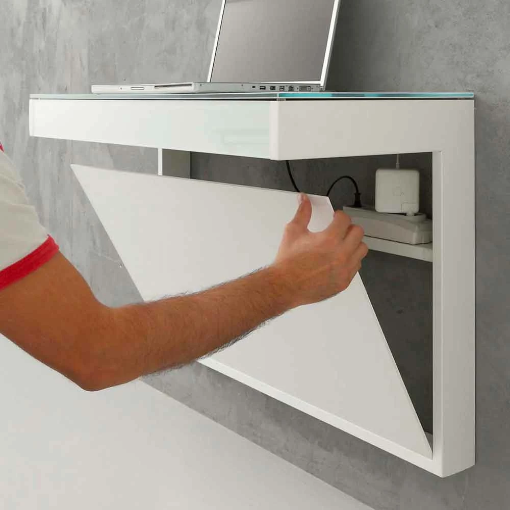 Hangend bureau met wandmontage gemaakt in Italië met glazen blad in glanzend witte afwerking met kabelgat, structuur in mat wit geverfd metaal en verwijderbaar verticaal paneel in wit plexiglas . Het is ook compleet met LED-verlichting aan de bovenkant en een praktische uittrekbare lade.