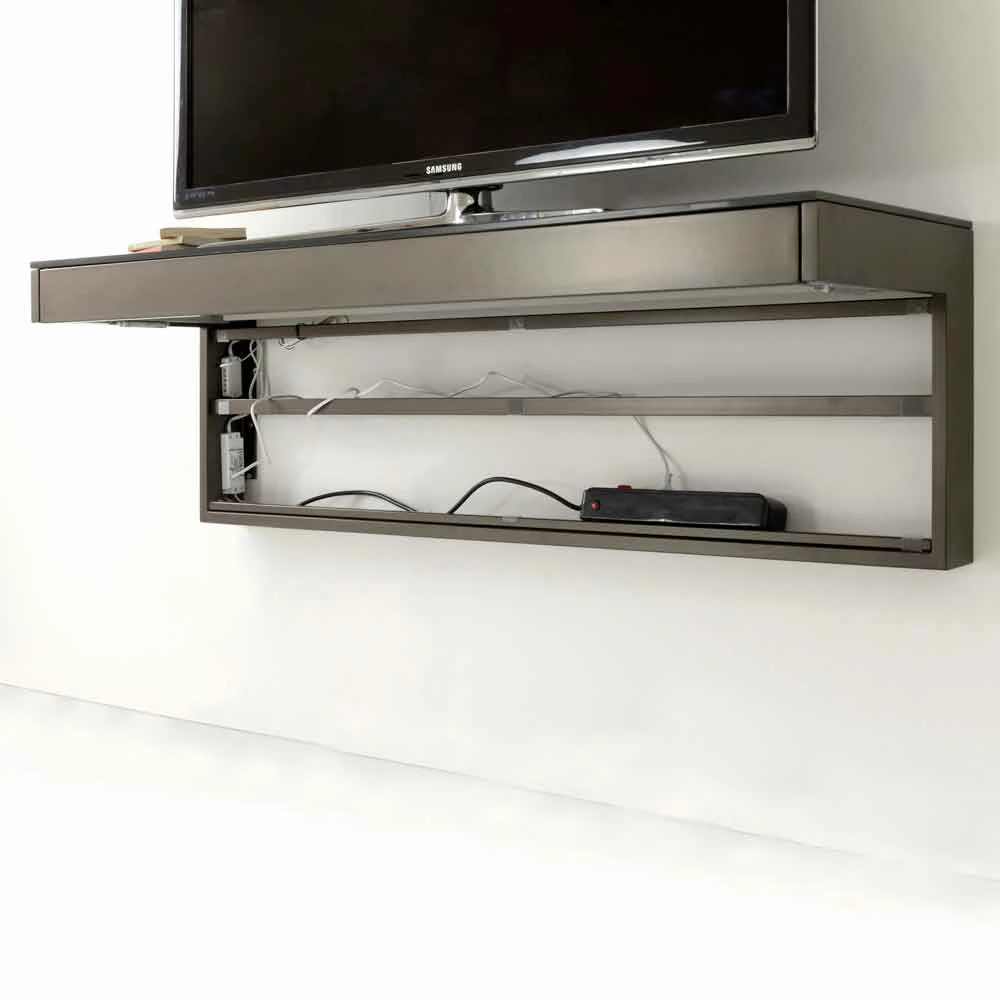 Moderne en elegante hangende tv-kast (wandmontage) gemaakt in Italië met bronzen afwerking anti-vingerafdruk satijnglazen blad met kabelgat, bruin geverfde metalen structuur en verwijderbaar verticaal paneel in plexiglas . Het is ook compleet met een verwijderbare lade aan de voorkant onder het blad en led-verlichting.