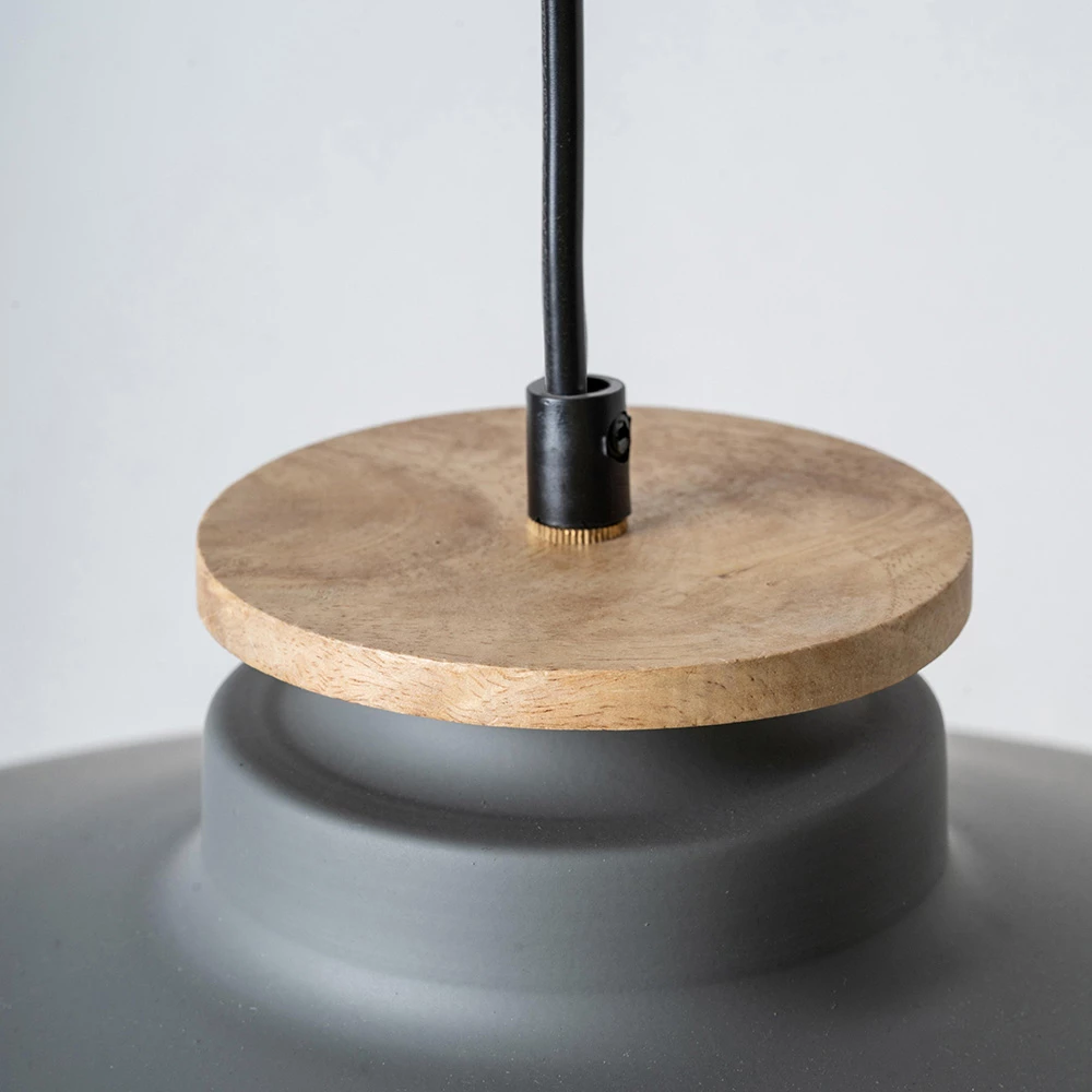 Hanglamp in grijs metaal en hout met nylon kabel.