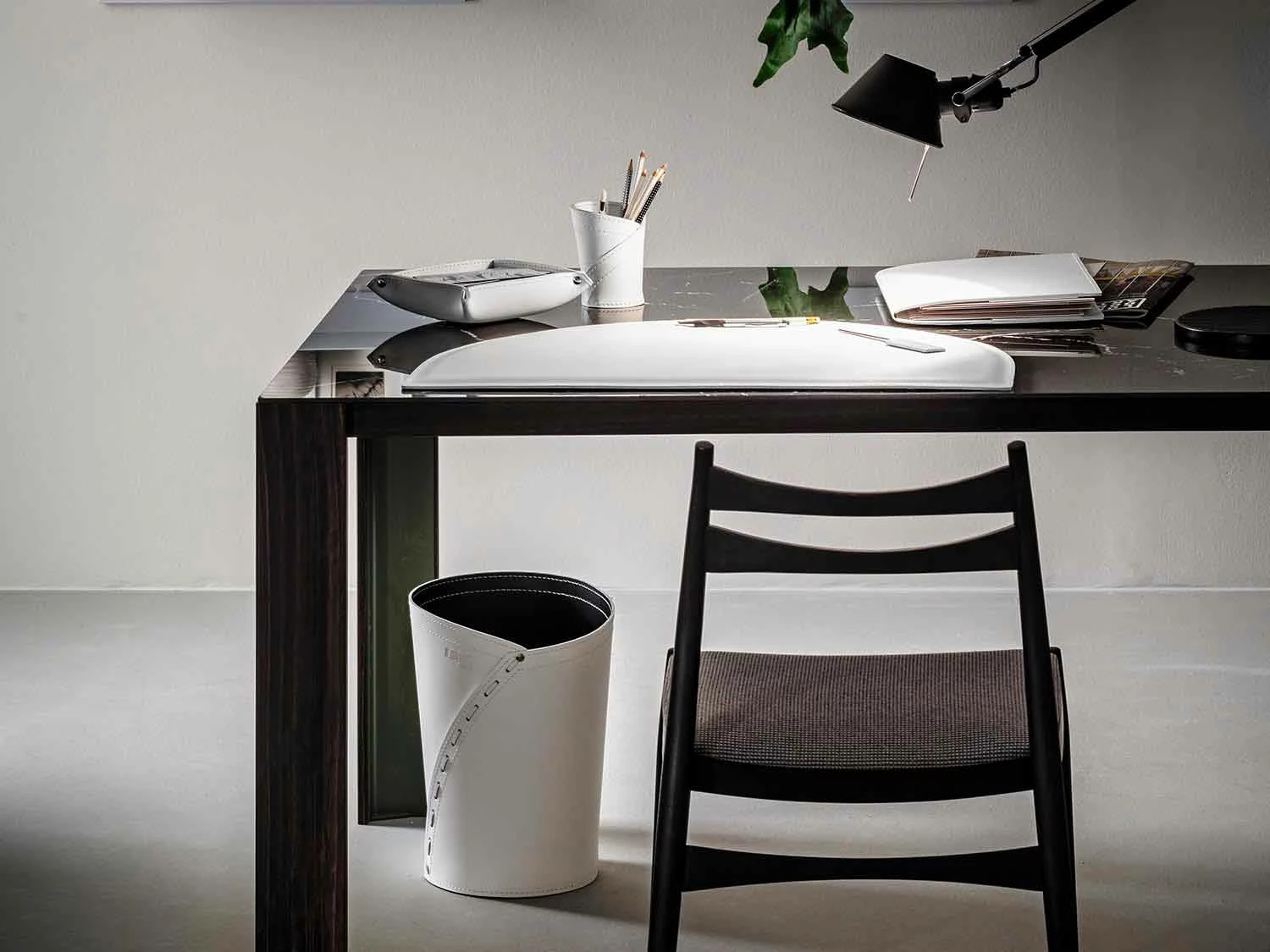 Ontwerp kantoorsamenstelling in geregenereerd leer handgemaakt in Italië.