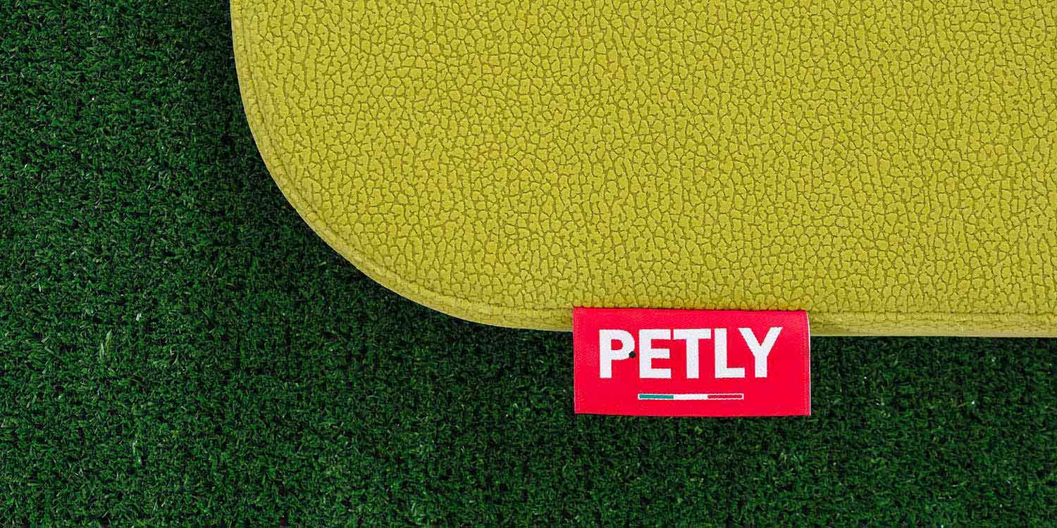 Hondenkennel binnenshuis met kussen met afgeronde hoeken en kunstgras tapijt, gemaakt in Italië.
