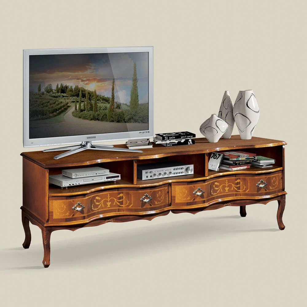 Klassieke houten tv-kast met vakken en lades Made in Italy.