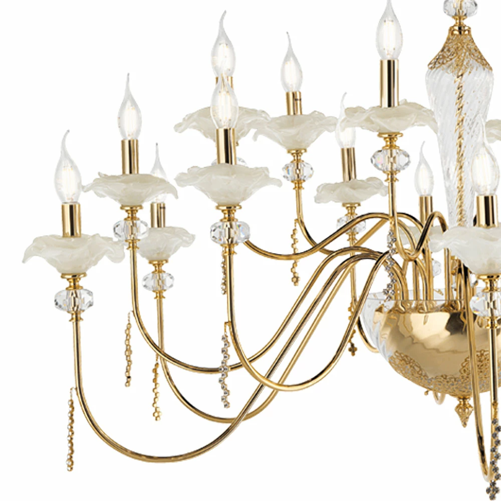 18-lichts kroonluchter in handgemaakt glas met knoppen en kristallen druppels, luxe gemaakt in Italië.