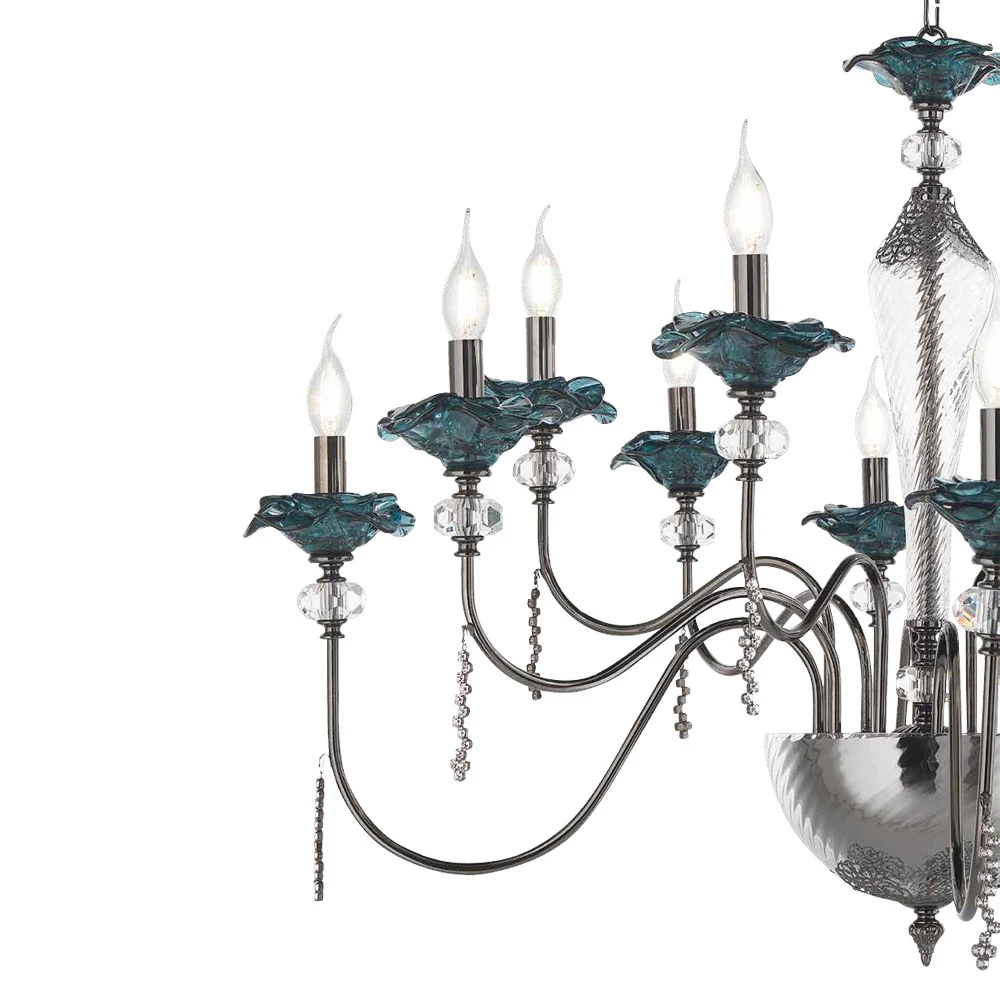De 18-lichts kroonluchter is een luxe verlichtingsaccessoire , volledig handgemaakt in Italië met een metalen structuur met zilveren lasnaden.