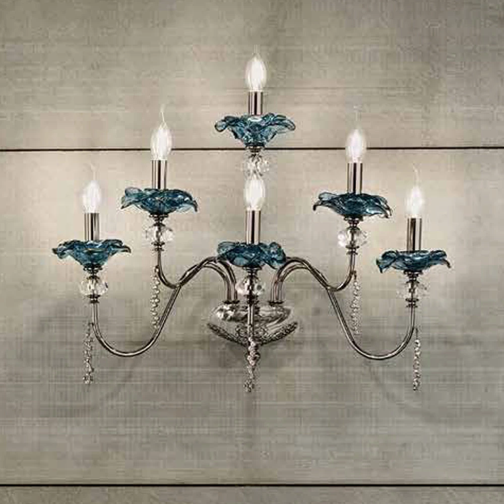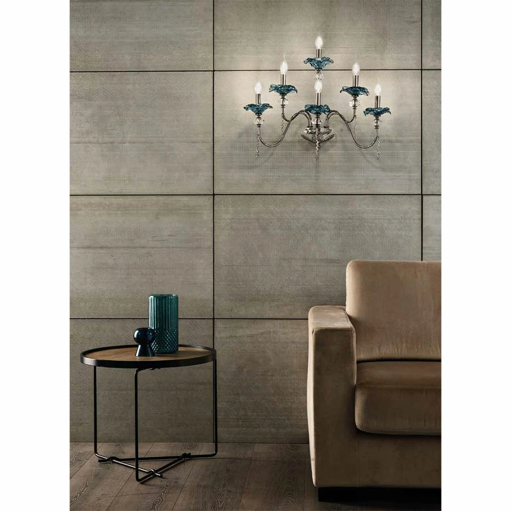 De 6-lichts wandlamp is een luxe verlichtingsaccessoire volledig handgemaakt in Italië met een metalen structuur met zilver laswerk.