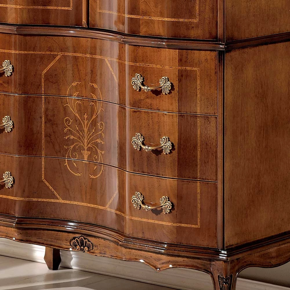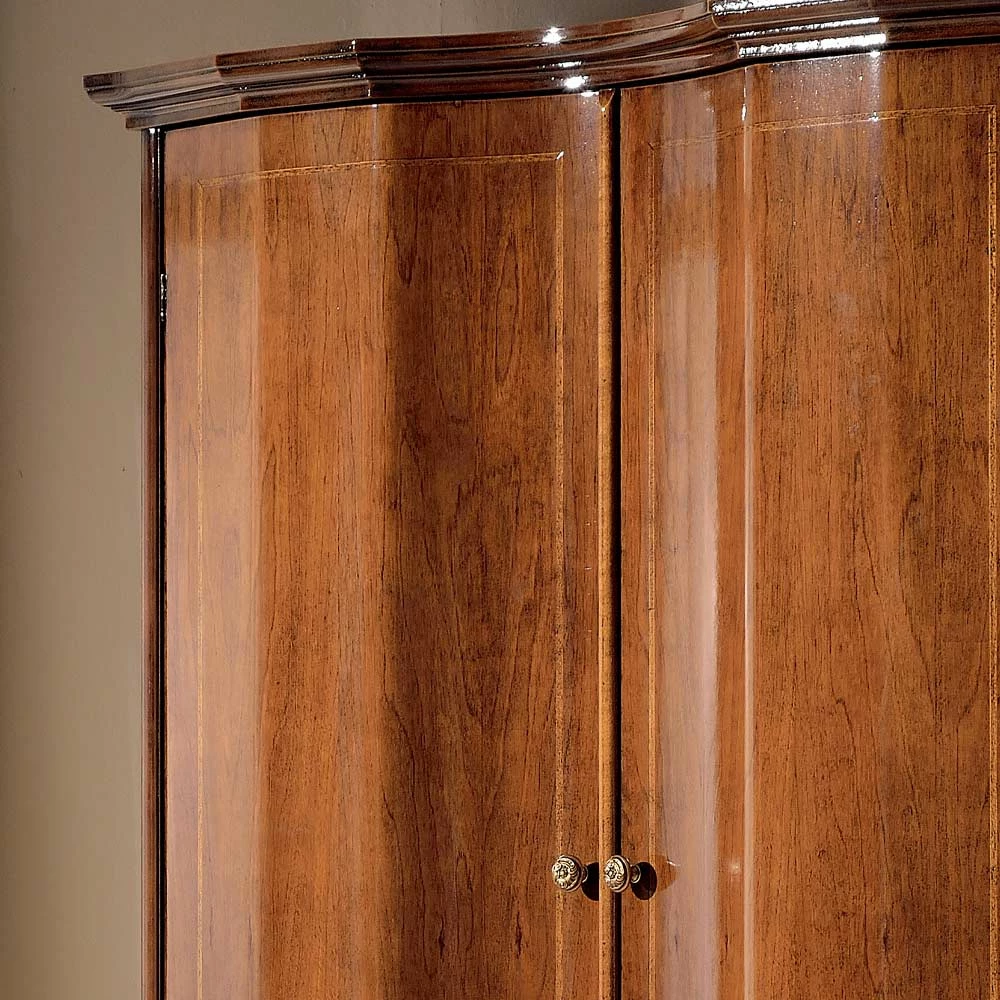 Deze verfijnde garderobe ideaal de slaapkamer inrichten in klassieke stijl heeft het twee deuren en drie laden. Alle stijl en vakmanschap die kenmerkend zijn voor het vakmanschap komen naar voren in dit weelderige meubel, gemaakt van kostbaar Bassano-notenhout met gouden inleg , waardoor het een verfijnde aanvulling is die de omgeving waarin het wordt geplaatst, kan verfraaien. Volledig gemaakt in Italië en handgemaakt door bekwame meesters , afgewerkt met wijsheid en smaak voor elegantie. De productie wordt uitgevoerd met behulp van fijne materialen en het werk wordt met de hand uitgevoerd met de grootste zorg en professionaliteit die Made in Italy- producten onderscheidt.