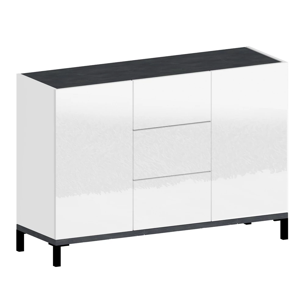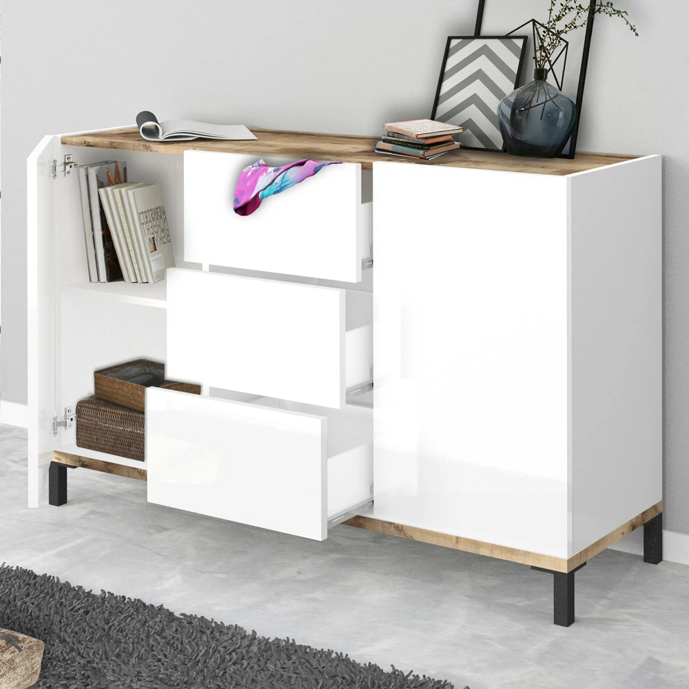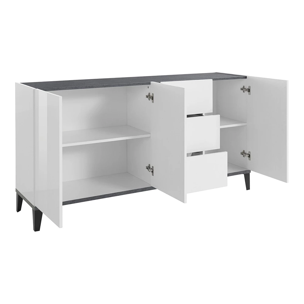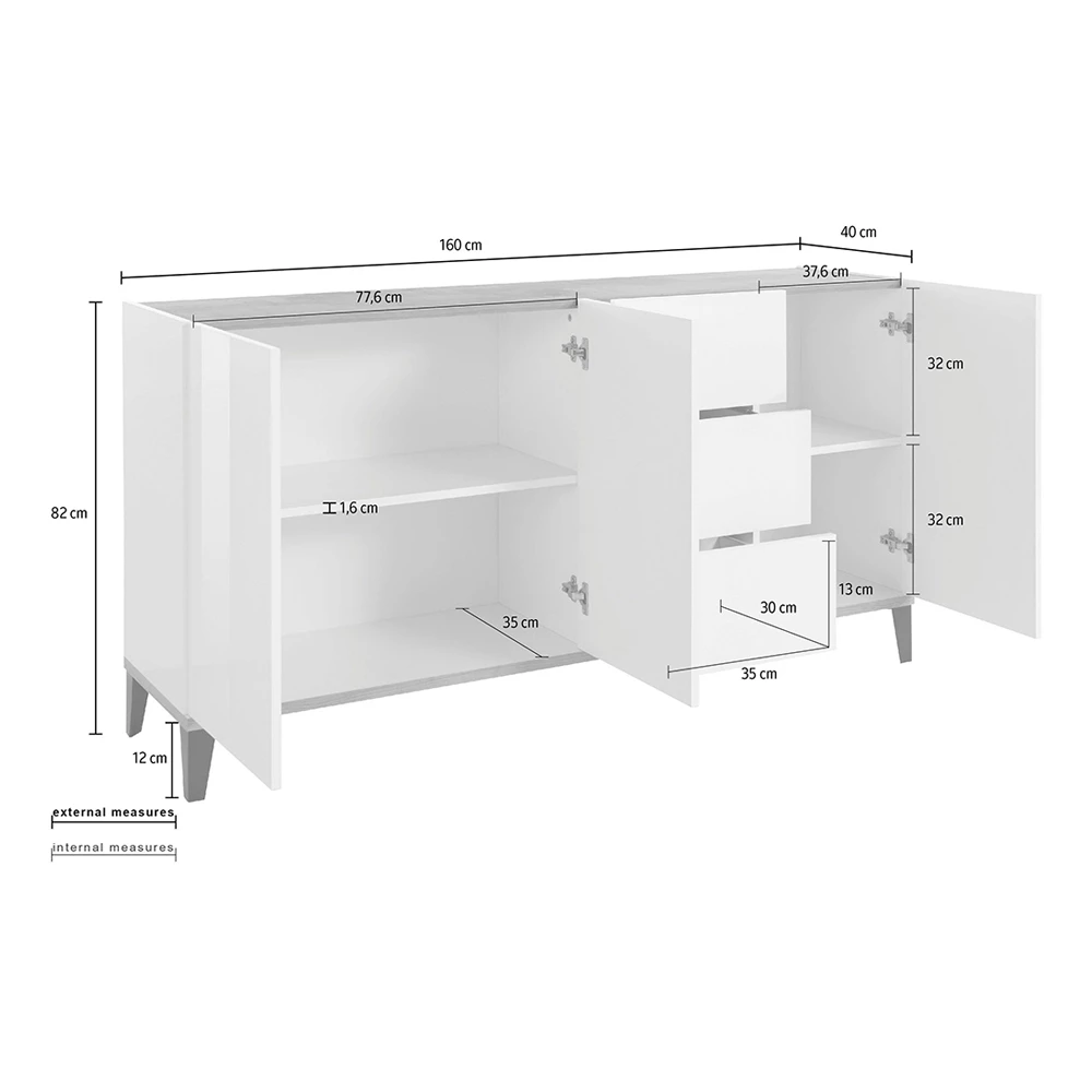 - L 160 x P 40 x H 82 cm – 3 deuren, 4 vakken en 3 schuifladen.