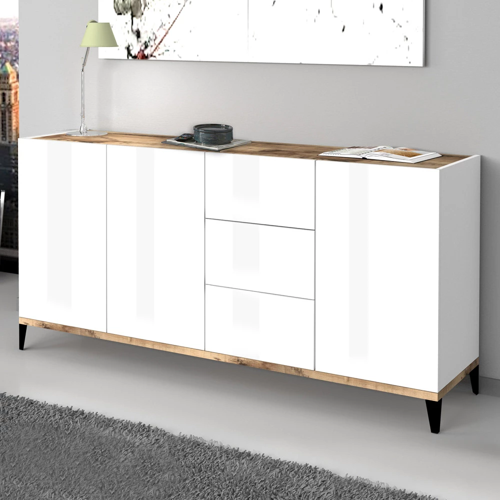 Het is een meubelstuk met een minimaal ontwerp dat een elegante esthetiek combineert met een brede bruikbaarheid. De voorkant met witte of houten afwerking, gecombineerd met de twee afwerkingen die de boven- en onderkant van het product bedekken, trekt de aandacht en creëert een chic en elegant effect voor een eenvoudig en interessant kleurenspel.
