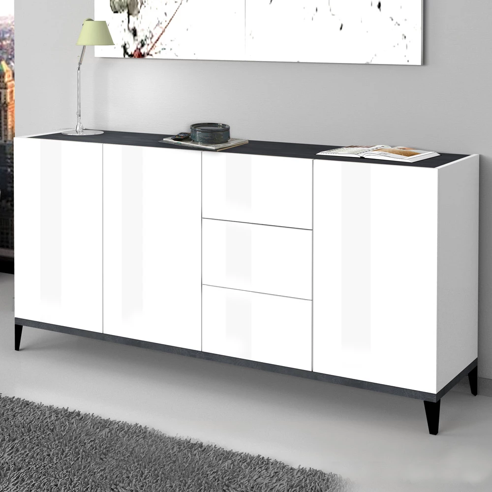 Laag dressoir gemaakt in Italië in melamine hout met eenvoudige maar elegante tinten, compleet met scharnierende deuren , 3 schuifladen en compartimenten met praktische planken die het product ruim en functioneel maken. Ideaal om in de gang of in de entree te worden geplaatst, de compacte afmetingen van dit dressoir stellen u in staat om de orde te handhaven en ruimte te besparen , perfect in elke omgeving te passen en een perfecte harmonie te creëren met de omringende elementen.