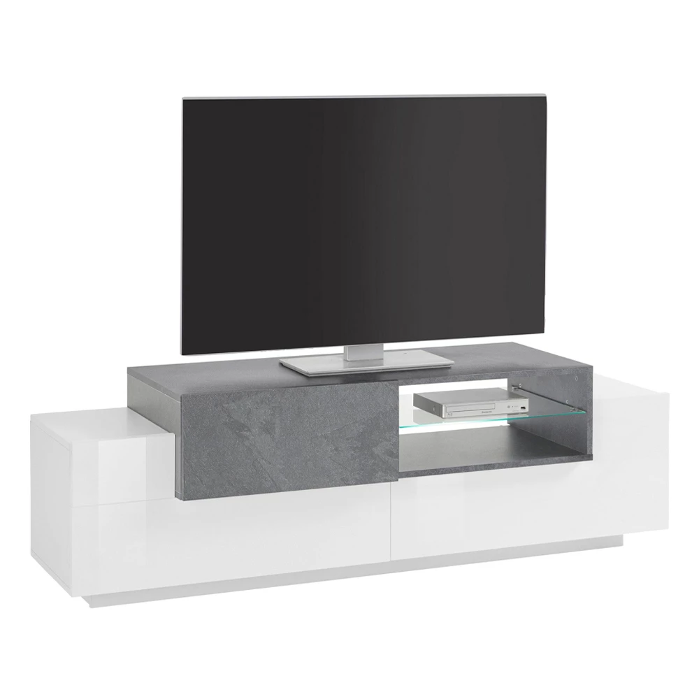 Het lage tv-meubel voor de woonkamer bestaat uit 2 zijklepdeuren van glanzend wit gelakt hout en 1 draaideur in melaminehout verkrijgbaar in twee afwerkingen met een centraal open compartiment met een glazen plank. Het aldus gecreëerde ontwerp vormt een suggestief en eigentijds contrast dat in de woonkamer moet worden geplaatst.