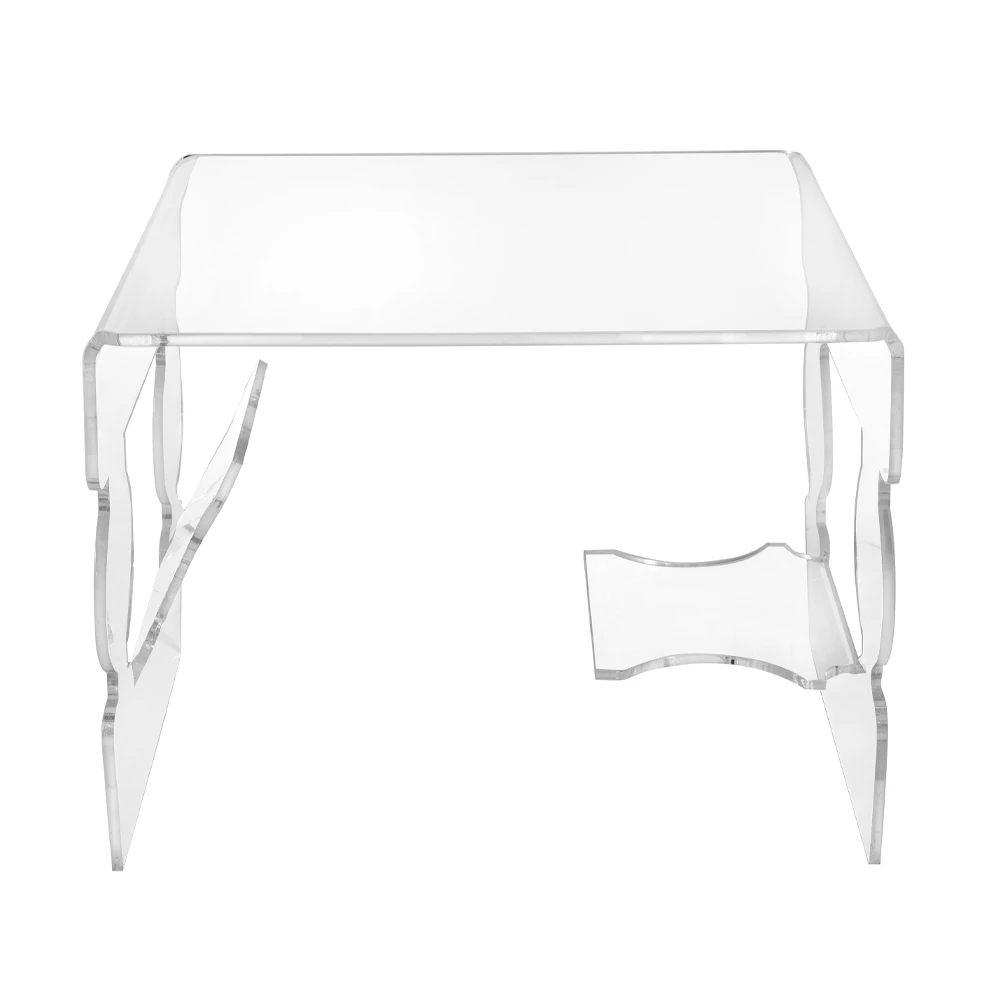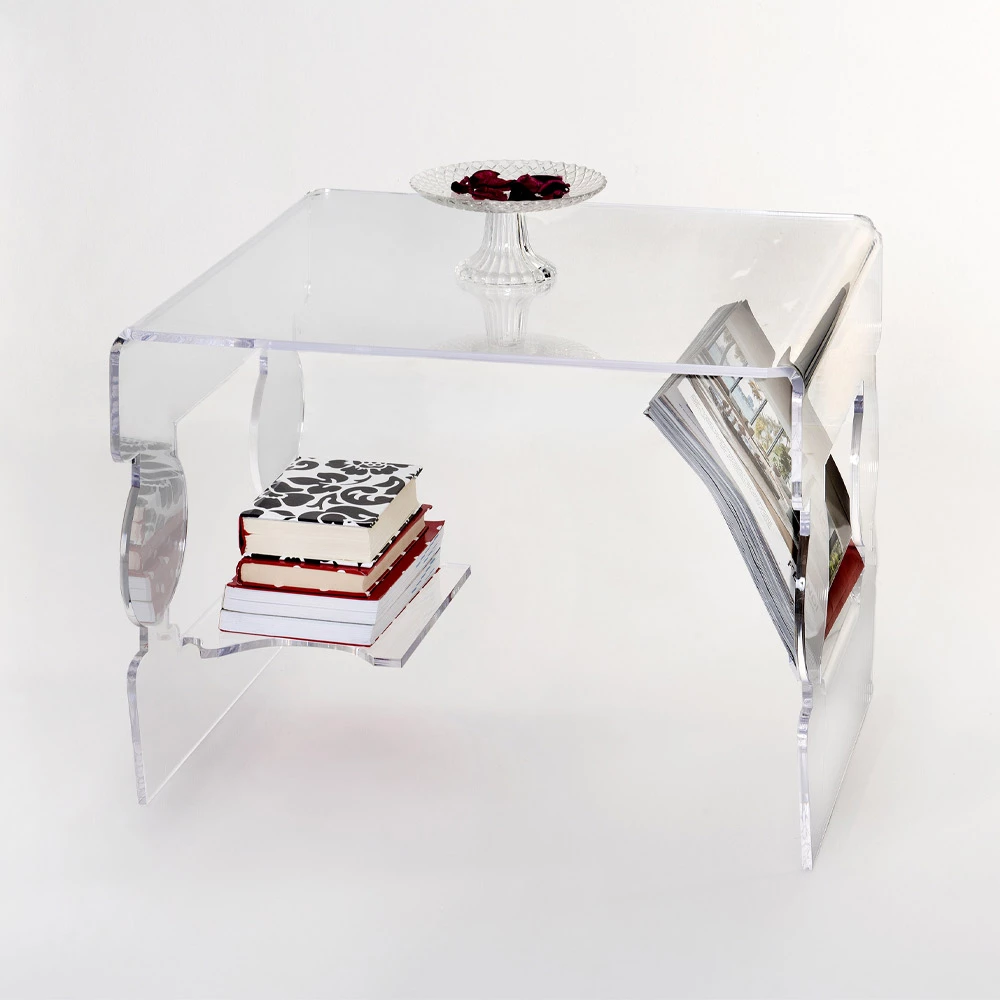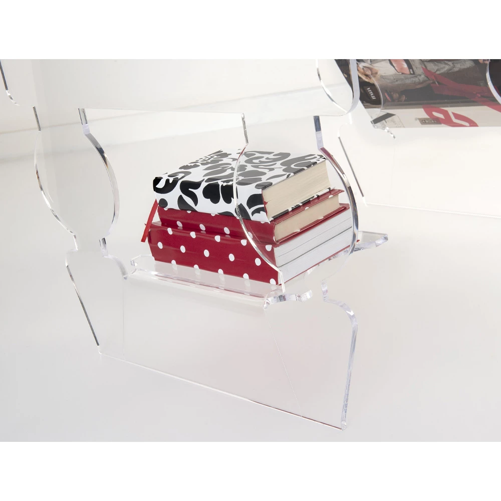 Transparante plexiglazen salontafel met tijdschriftenplanken, made in Italy.