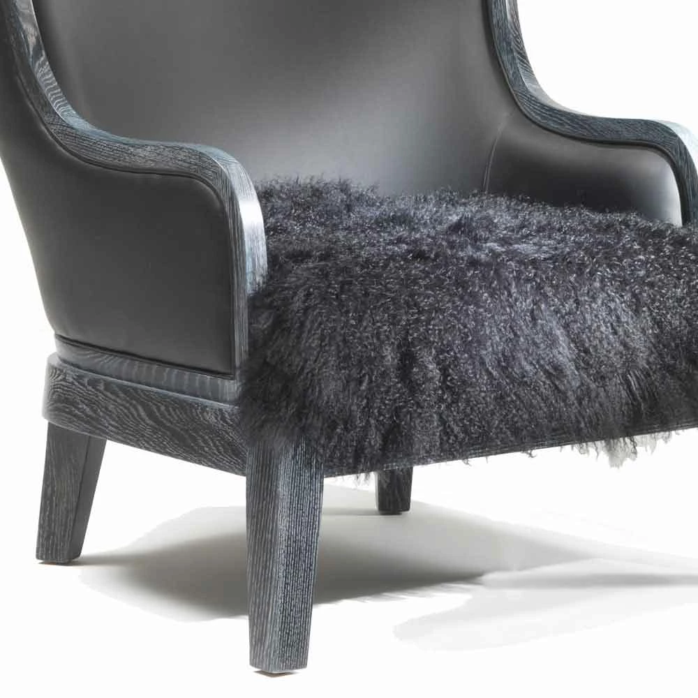 Fauteuil met hoge rug. Terug bekleed met zwart leer. Zitting bekleed met zwart tibet lam bont. Frame en houten voet. Afgewerkt in zwart eik.