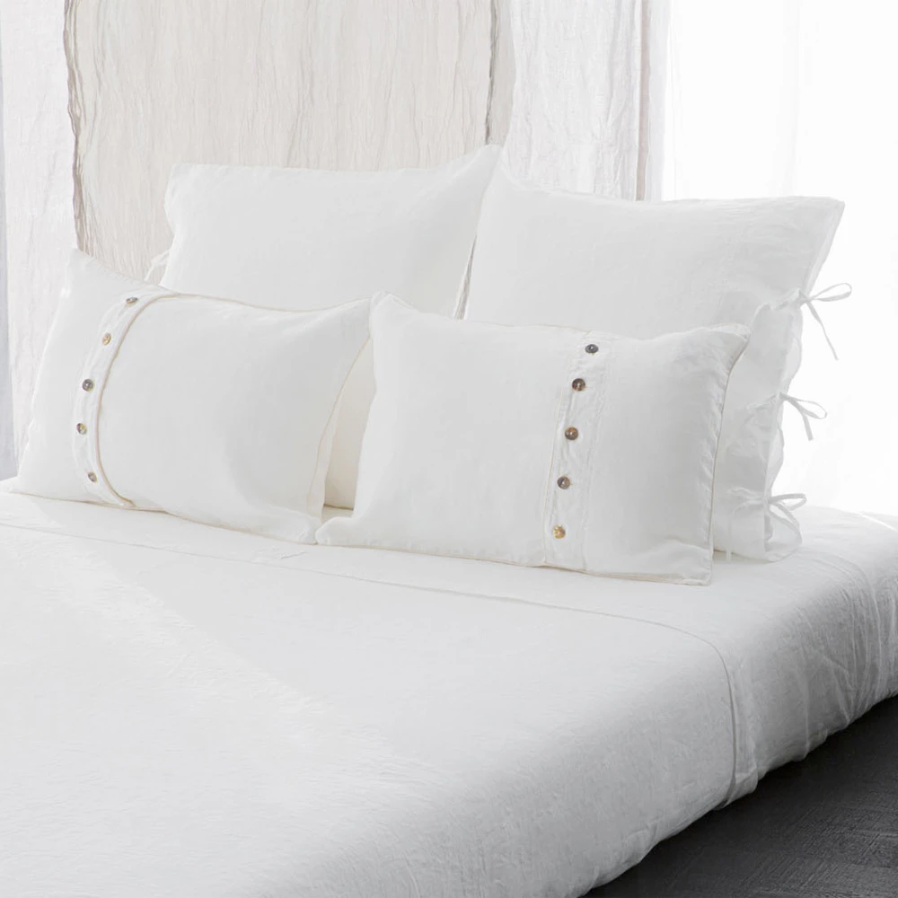 De kussensloop is gemaakt in Italië, gemaakt van 100% hoogwaardig linnen en voelt zacht aan dankzij speciale behandelingen die de natuurlijke uitstraling versterken. Het is een ideale stof voor het bed omdat het hypoallergeen en antibacterieel is , dankzij het gebruik van natuurlijke en hypoallergene kleurstoffen die glans en zwier geven.