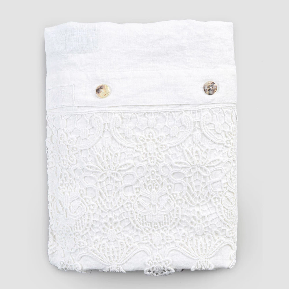 Dubbel dekbedovertrek in wit linnen met kanten druppels, handgemaakt luxe design gemaakt in Italië.